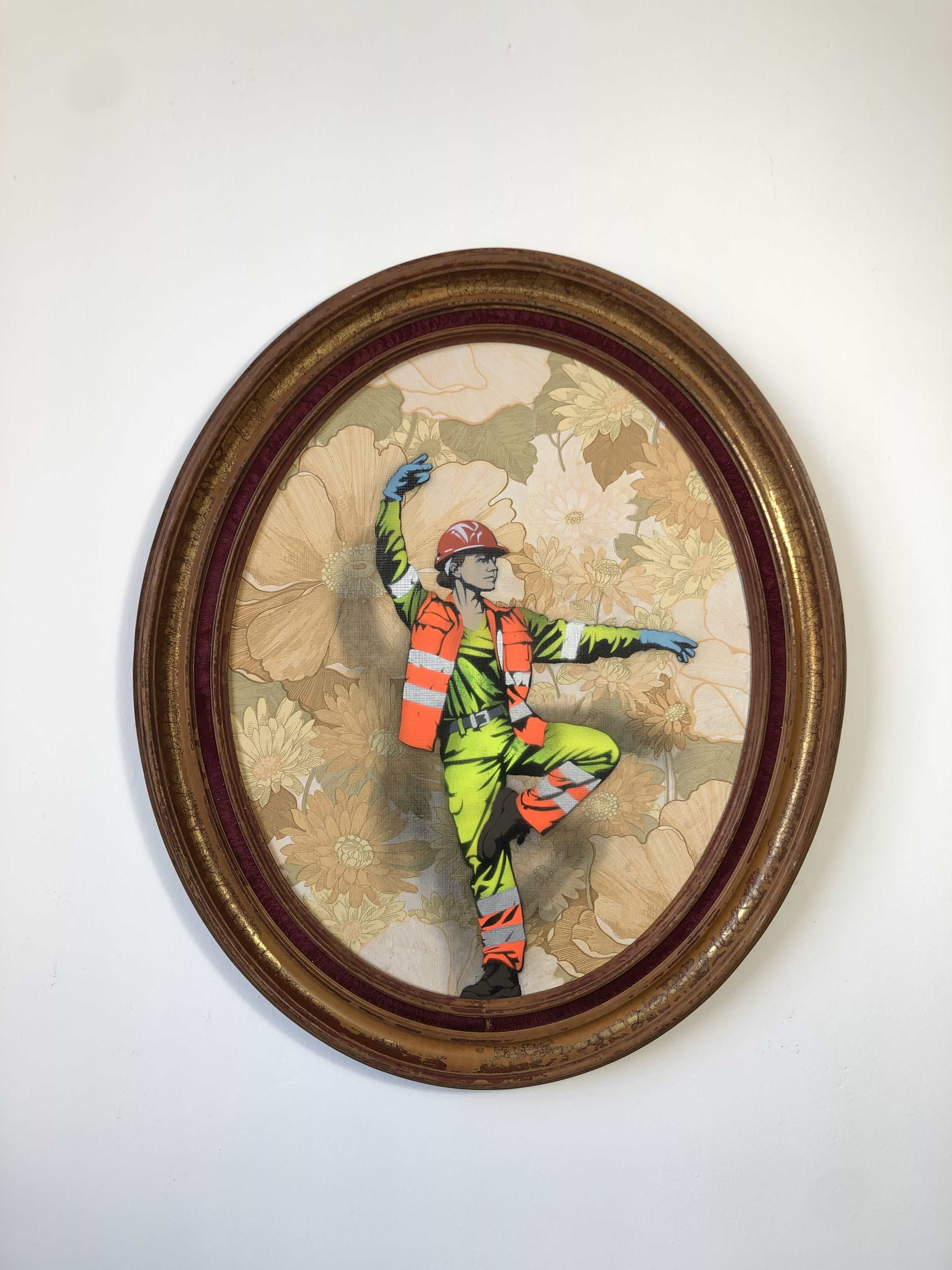 AcheterVendue avec encadrement. Représenté dans un cadre ovale et sur un fond floral, un travailleur en tenue de chantier adopte une pose rappelant le ballet. La forme du cadre et la posture stylisée renforcent l’idée de portrait, célébrant la dignité et l’élégance d’un corps habituellement invisible.