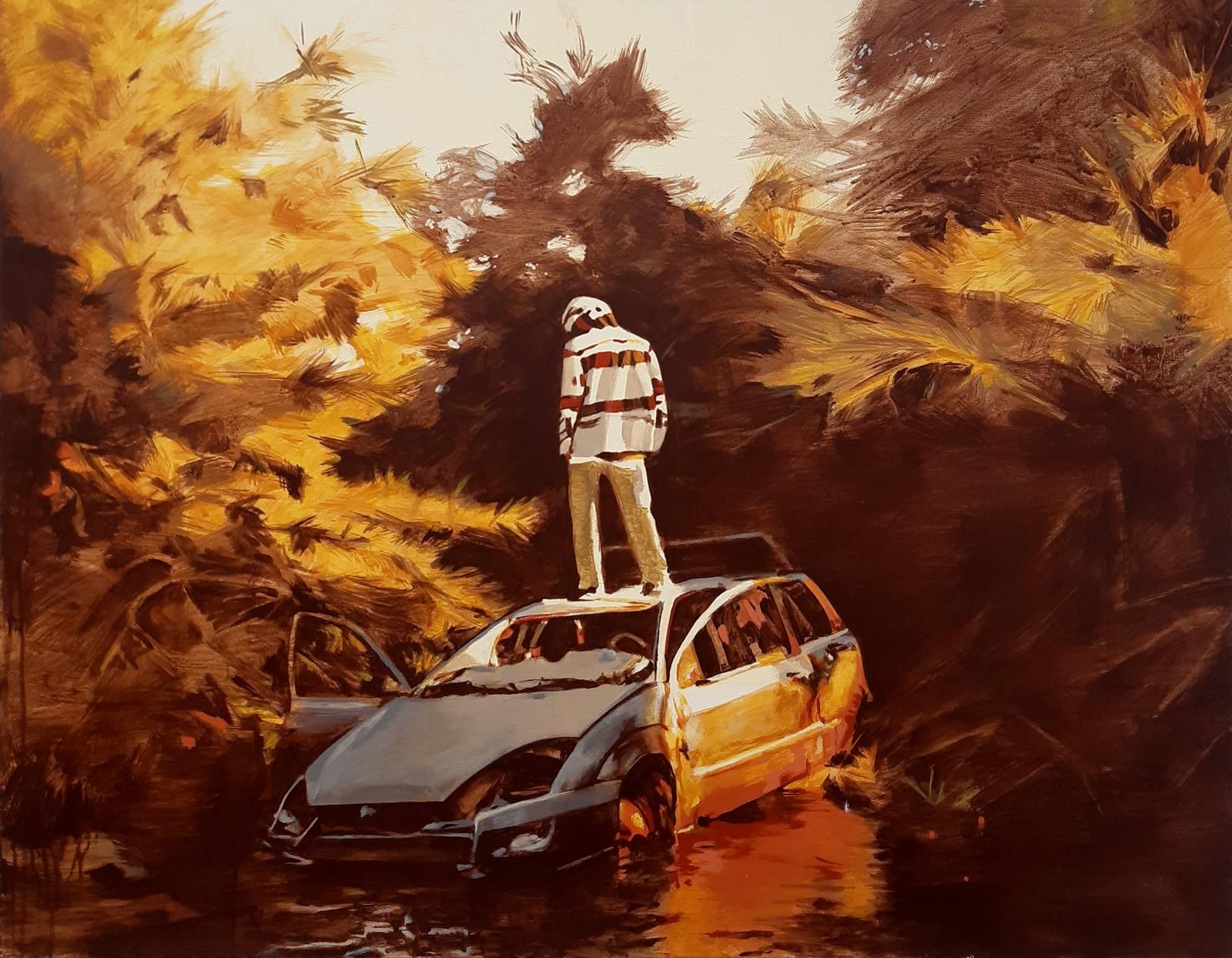 RéserverCette peinture représente une scène marquante : une personne debout sur le toit d’une voiture accidentée, partiellement immergée dans l’eau. La silhouette, placée de dos, semble observer l’environnement qui l’entoure, un paysage dense et foisonnant, dominé par des teintes chaudes allant du brun au doré. Les coups de pinceau, expressifs et texturés, créent un contraste entre la rigidité du véhicule endommagé et la végétation presque vibrante qui envahit l’arrière-plan. L’ensemble dégage une atmosphère à la fois intrigante et contemplative, laissant au spectateur la liberté d’imaginer le récit derrière cette scène suspendue.