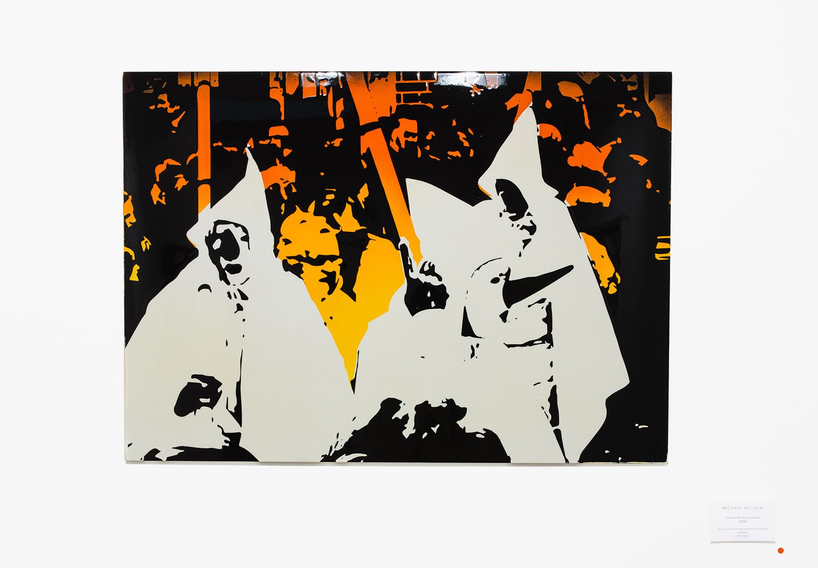 Dans cette œuvre intitulée "Carnaval des Blancs Moussis" (69,5 x 50 cm), Michaël Nicolaï utilise du spray sur une plaque en acier, vernie en carrosserie avec six passages. Inspiré par les personnages et les œuvres de James Ensor, Nicolaï capture l'essence du carnaval avec une approche contemporaine. Les couleurs vives et les figures excentriques rendent hommage à Ensor tout en reflétant le style unique de Nicolaï.
