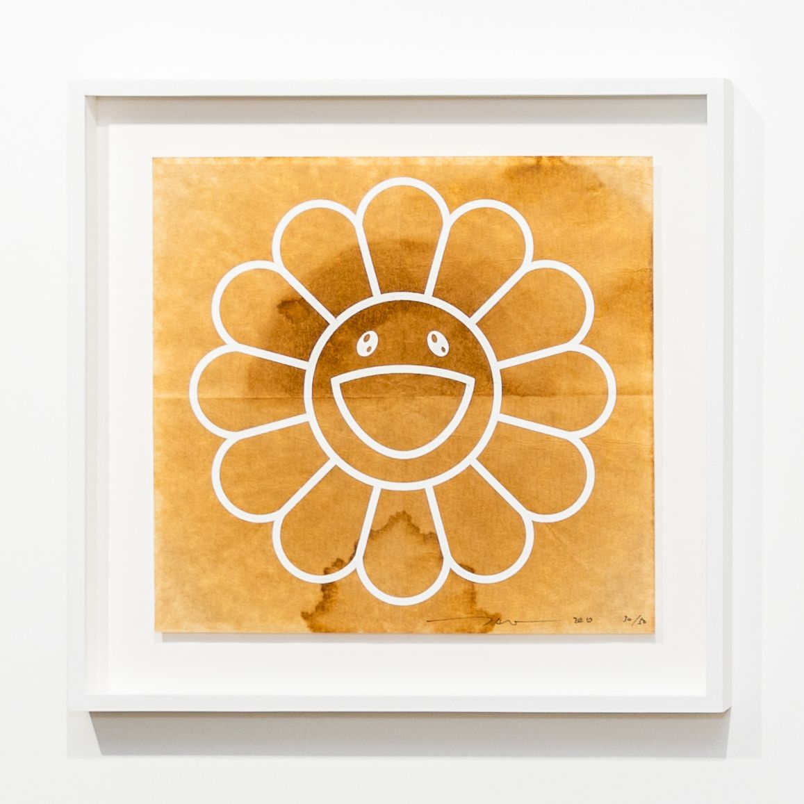 Cette œuvre est une sérigraphie posée sur un filtre à café usagé. Elle est signée Takashi Murakami, un artiste japonais de renommée mondiale. Peintre et sculpteur japonais, il est notamment connu comme l’initiateur du mouvement d’art contemporain, le Superflat, qui trouve ses influences dans les animes, les mangas et la pop-culture japonaise. Les œuvres de Takashi Murakami sont un voyage entre la tradition et la modernité. Ses fleurs colorées aux visages souriants sont sans doute sa marque de fabrique la plus reconnaissable.