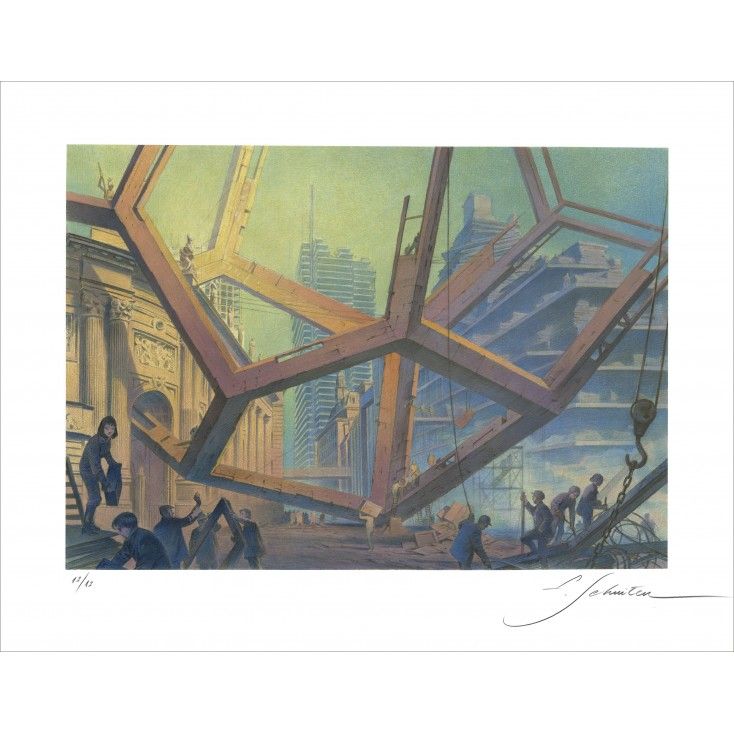 AcheterDans cette œuvre saisissante, François Schuiten explore la tension entre l’architecture monumentale et l’effort humain, représentant une scène de construction surréaliste où d’immenses structures géométriques s’élèvent au cœur d’un paysage urbain. Alliant imaginaire narratif, architecture fantastique et jeux de lumière, Schuiten compose un monde en pleine transformation. Ce tirage pigmentaire raffiné est présenté par la Buronzu Gallery.