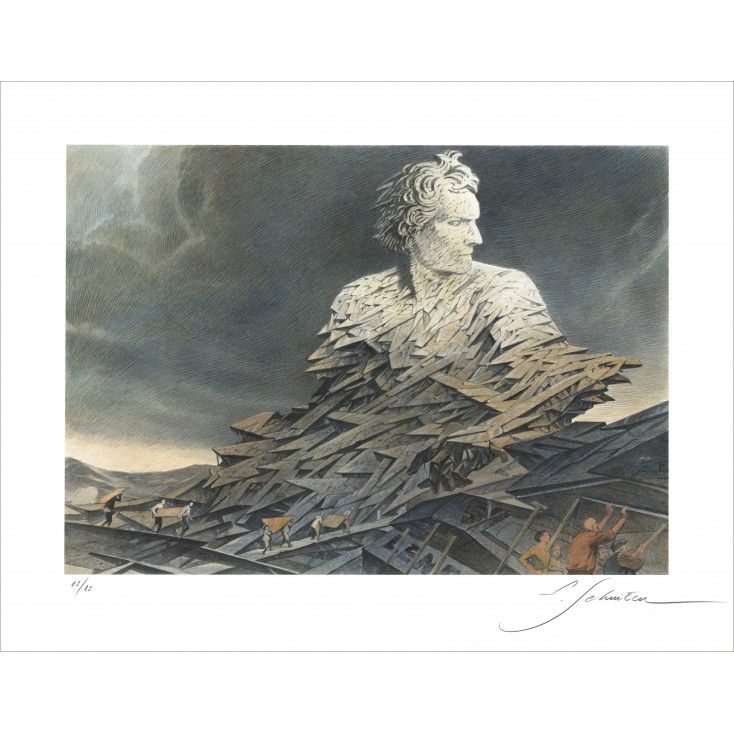 AcheterDans Compulsion – Northern Italy, François Schuiten imagine une figure monumentale surgissant d’un paysage architectural fragmenté, mêlant présence humaine, formes sculpturales et structures géométriques. La scène évoque à la fois la transformation et la résilience, tandis que des ouvriers assemblent un être colossal façonné par une multitude d’éclats architecturaux. Grâce à sa maîtrise de la lumière, de la texture et d’une architecture visionnaire, Schuiten compose une image à la fois mythique et contemporaine. Ce tirage pigmentaire raffiné est présenté par la Buronzu Gallery.