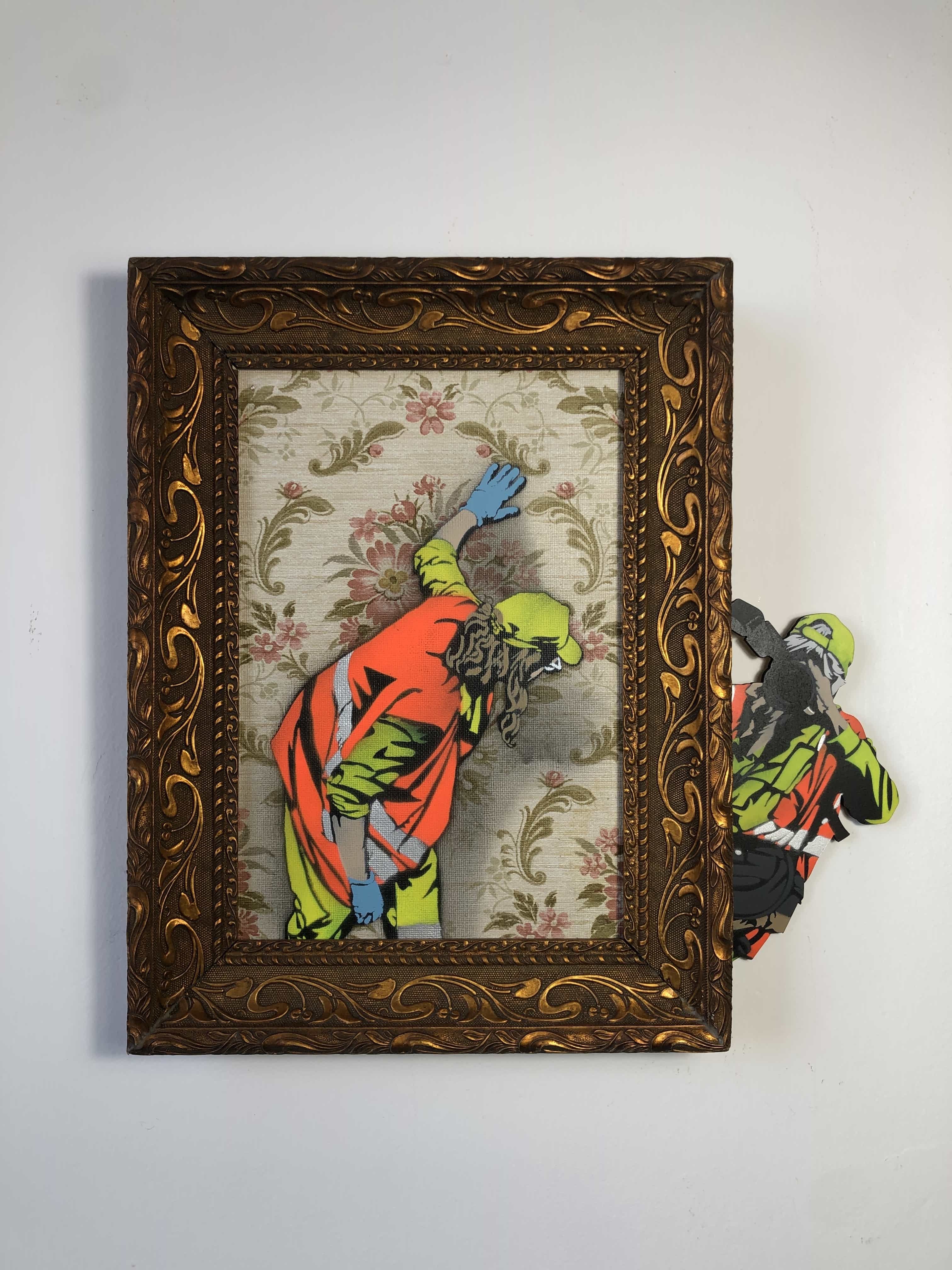 AcheterVendue avec encadrement. Dans un cadre rectangulaire richement ornementé, une figure se penche tandis qu’une autre présence déborde hors de la limite. Le geste perturbe l’illusion du confinement, révélant le cadre comme une frontière fragile plutôt qu’un espace clos.