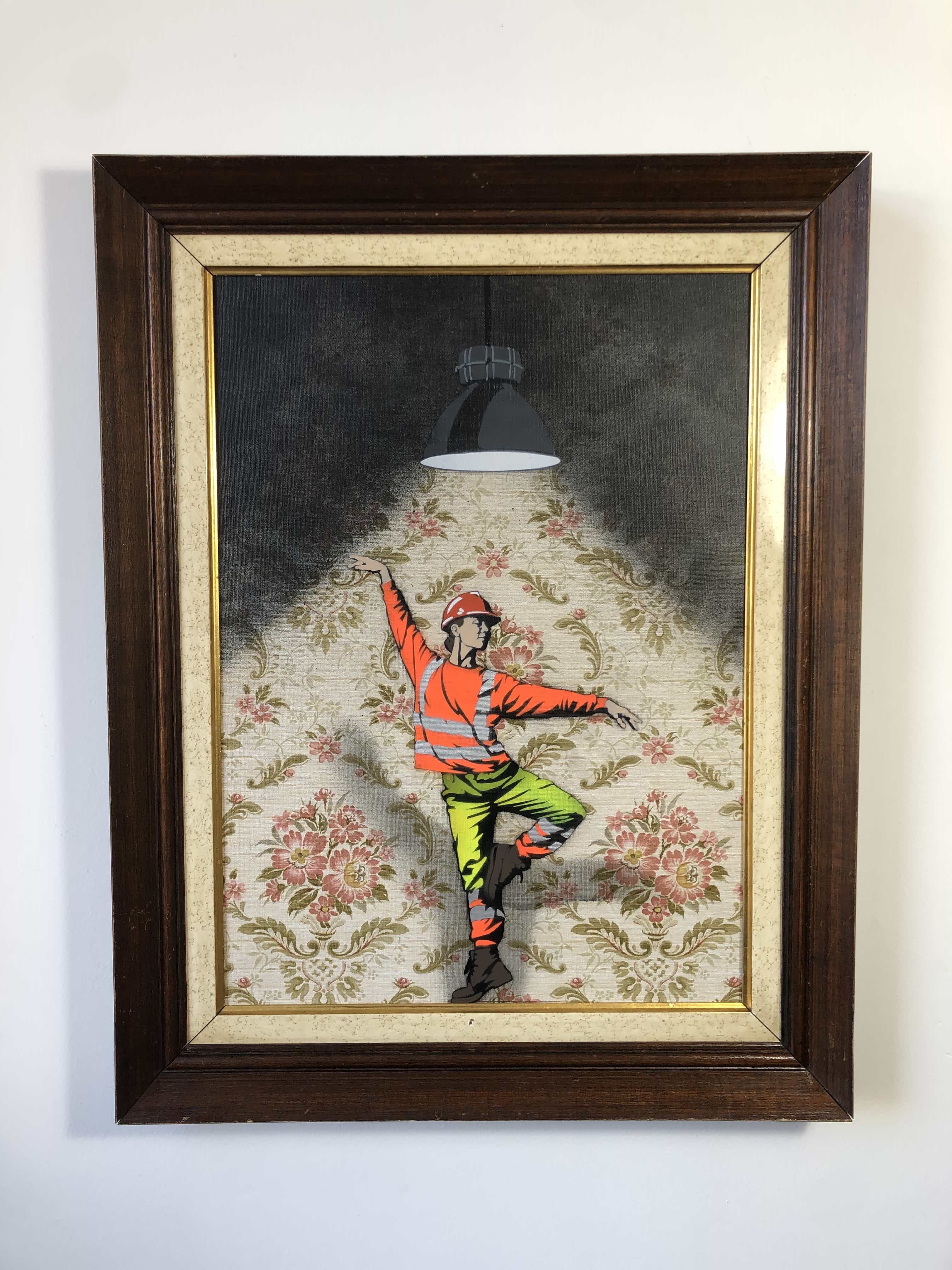 AcheterVendue avec encadrement. Isolée sous une lampe industrielle suspendue, une figure solitaire s’équilibre dans une posture presque chorégraphique. Le faisceau de lumière dessine une scène domestique au sein du fond floral, brouillant les frontières entre travail, performance et introspection silencieuse.