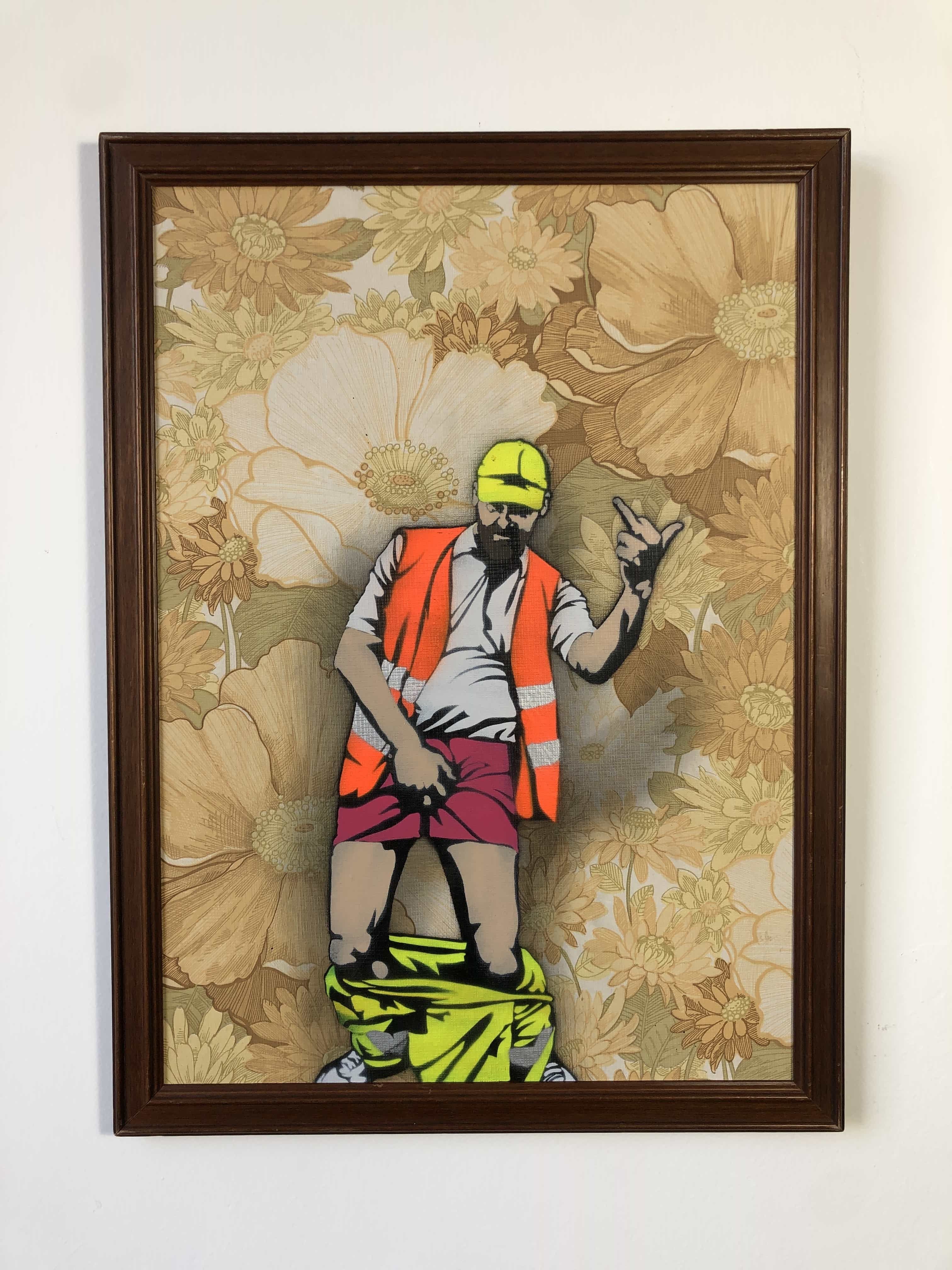 Vendue avec encadrement. Sur un fond floral délicat, une figure solitaire adopte une posture ouvertement transgressive. Le contraste entre tenue industrielle, vulnérabilité exposée et décor ornemental instaure une ironie franche et dérangeante.