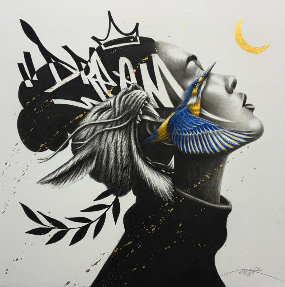 AcheterŒuvre réalisée par NOIR Artist à l'occasion de l'Affordable Art Fair. Exposée par la Buronzu Gallery, cette œuvre unique a été créée à l'aide de fusains, pierre noire et feuille d'or sur papier. NOIR artist est un duo d'artistes muralistes basé à Liège avec un style unique mêlant symbolisme, finesse graphique et puissance visuelle.