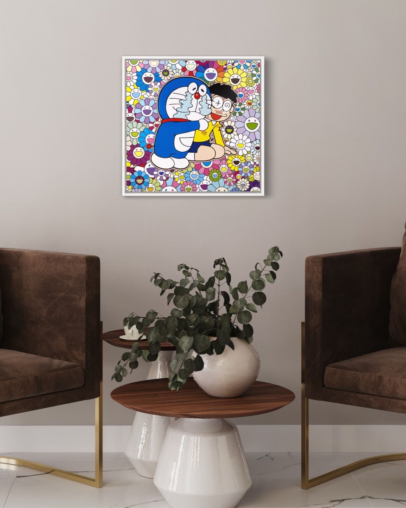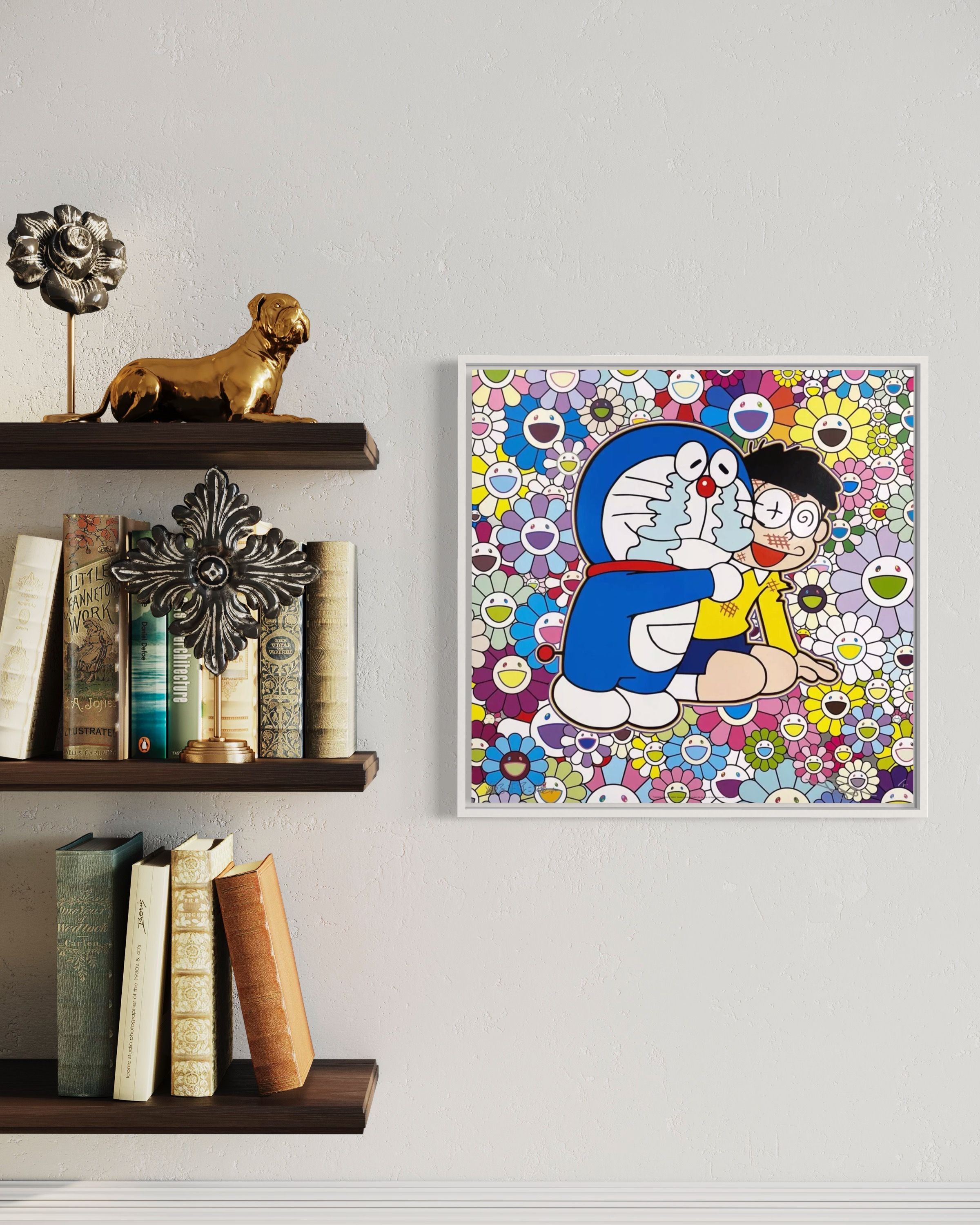 Cette œuvre est le fruit du mélange entre le personnage Doraemon de Fujiko Fujio et l’univers coloré de Takashi Murakami, un artiste japonais de renommée mondiale. Peintre et sculpteur japonais, il est notamment connu comme l’initiateur du mouvement d’art contemporain, le Superflat, qui trouve ses influences dans les animes, les mangas et la pop-culture japonaise. Les œuvres de Takashi Murakami sont un voyage entre la tradition et la modernité. Ses fleurs colorées aux visages souriants sont sans doute sa marque de fabrique la plus reconnaissable.