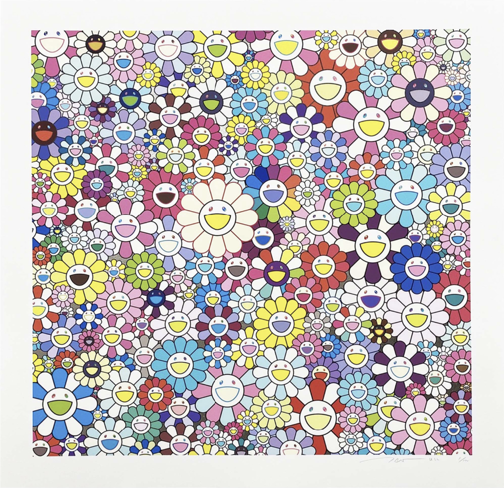 Cette œuvre colorée est signée Takashi Murakami, un artiste japonais de renommée mondiale. Peintre et sculpteur japonais, il est notamment connu comme l'initiateur du mouvement d'art contemporain, le Superflat, qui trouve ses influences dans les animes, les mangas et la pop-culture japonaise. Les œuvres de Takashi Murakami sont un voyage entre la tradition et la modernité. Ses fleurs colorées aux visages souriants sont sans doute sa marque de fabrique la plus reconnaissable.