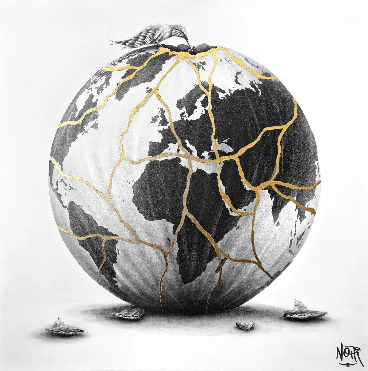 AcheterInspirée de l’art du kintsugi japonais, cette Terre fracturée et recollée à la feuille d’or illustre la fragilité du monde et sa capacité à renaître de ses blessures. Le contraste entre le noir et le blanc, brisé par les cicatrices dorées, porte un message universel d’espoir, de résilience et de reconstruction.