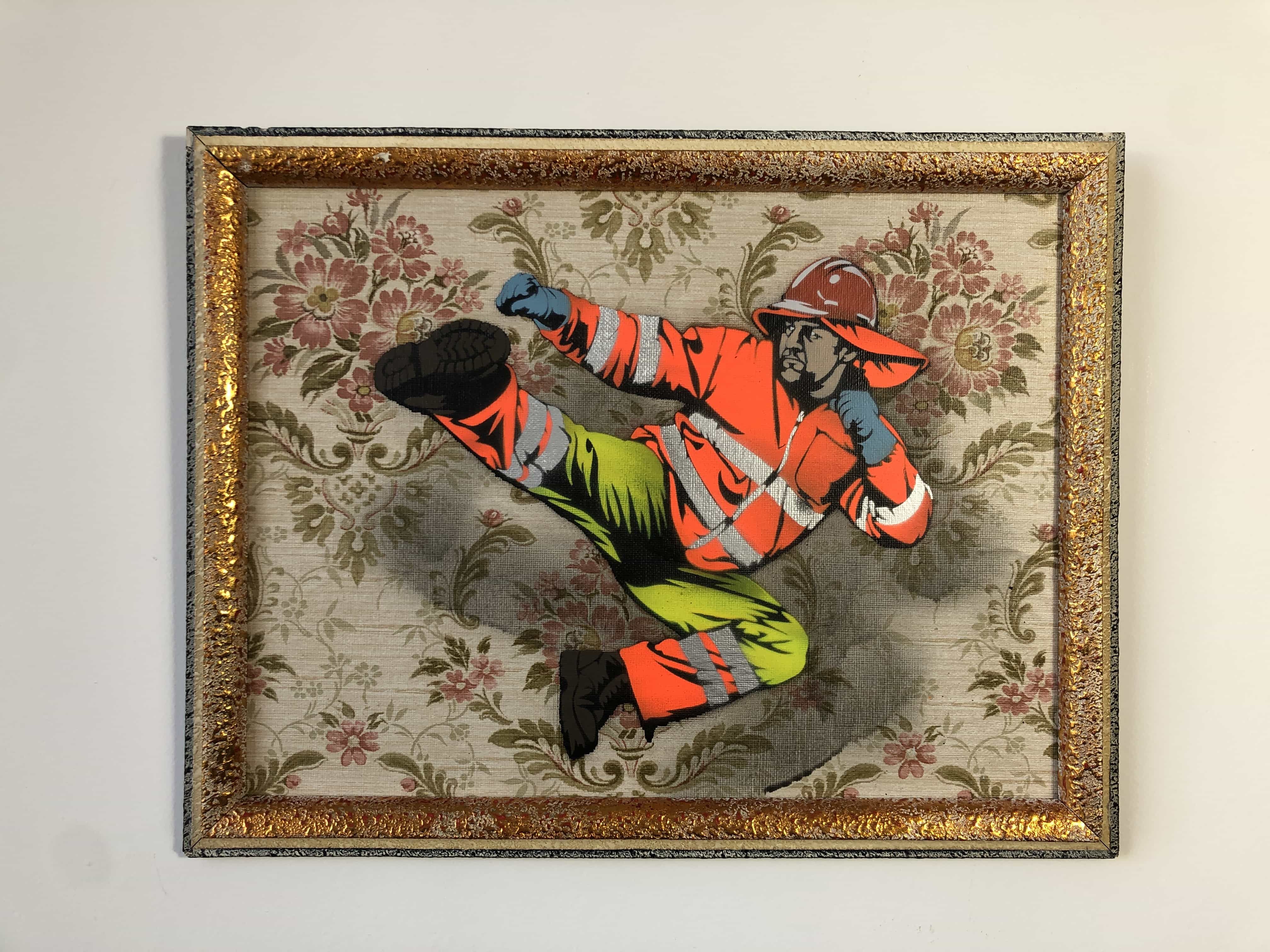 AcheterVendue avec encadrement. Figée en plein mouvement dans un cadre rectangulaire doré, une figure ouvrière semble suspendue entre combat et danse. Le fond floral atténue la violence du geste, transformant l’action en immobilité chorégraphiée.