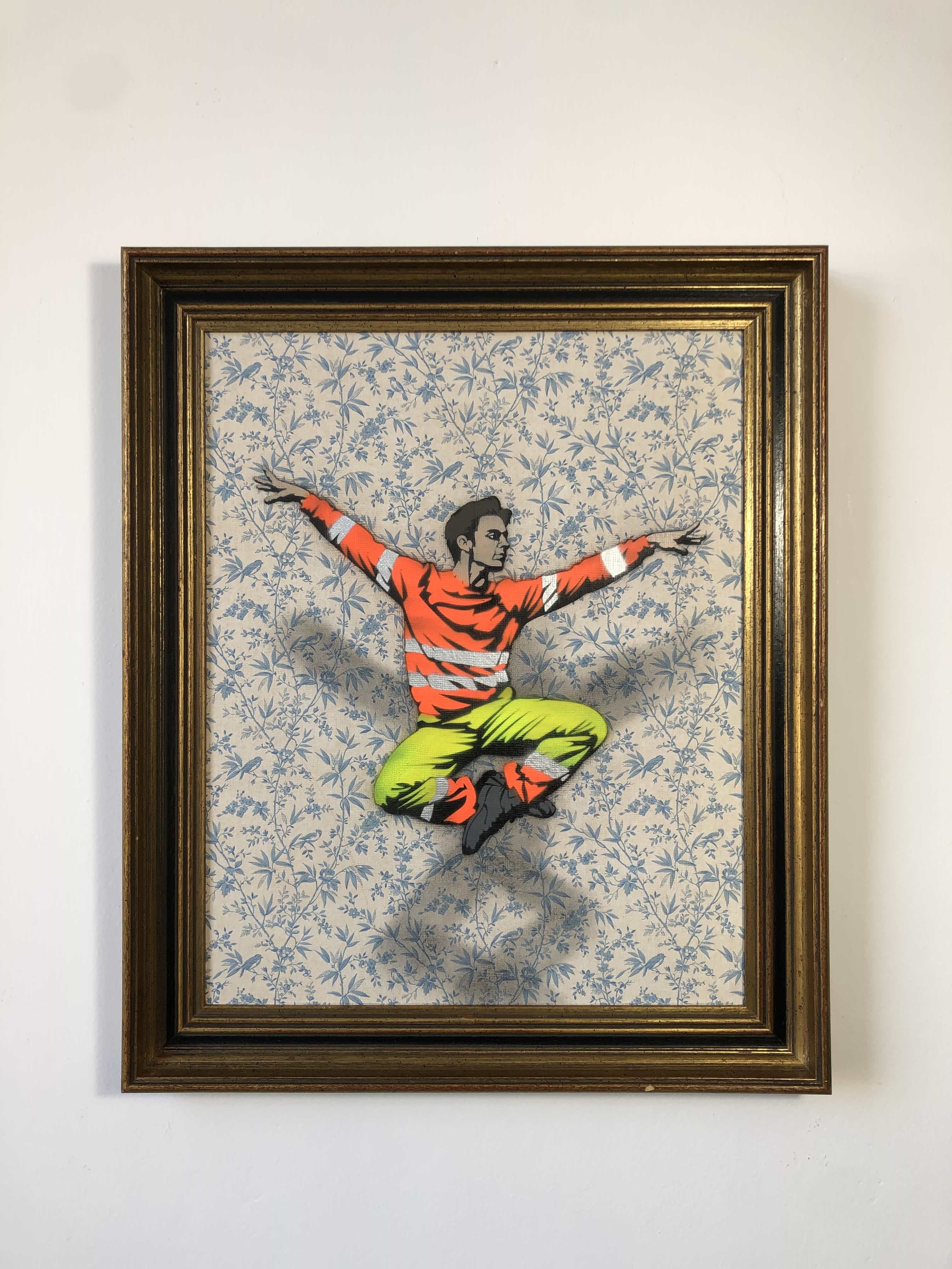AcheterVendue avec encadrement. Un travailleur en tenue de chantier est figé dans un saut inspiré de la danse classique. Isolé sur un fond de papier peint floral et encadré comme un portrait ancien, le corps suspendu évoque un instant de grâce inattendue, entre effort physique et légèreté.