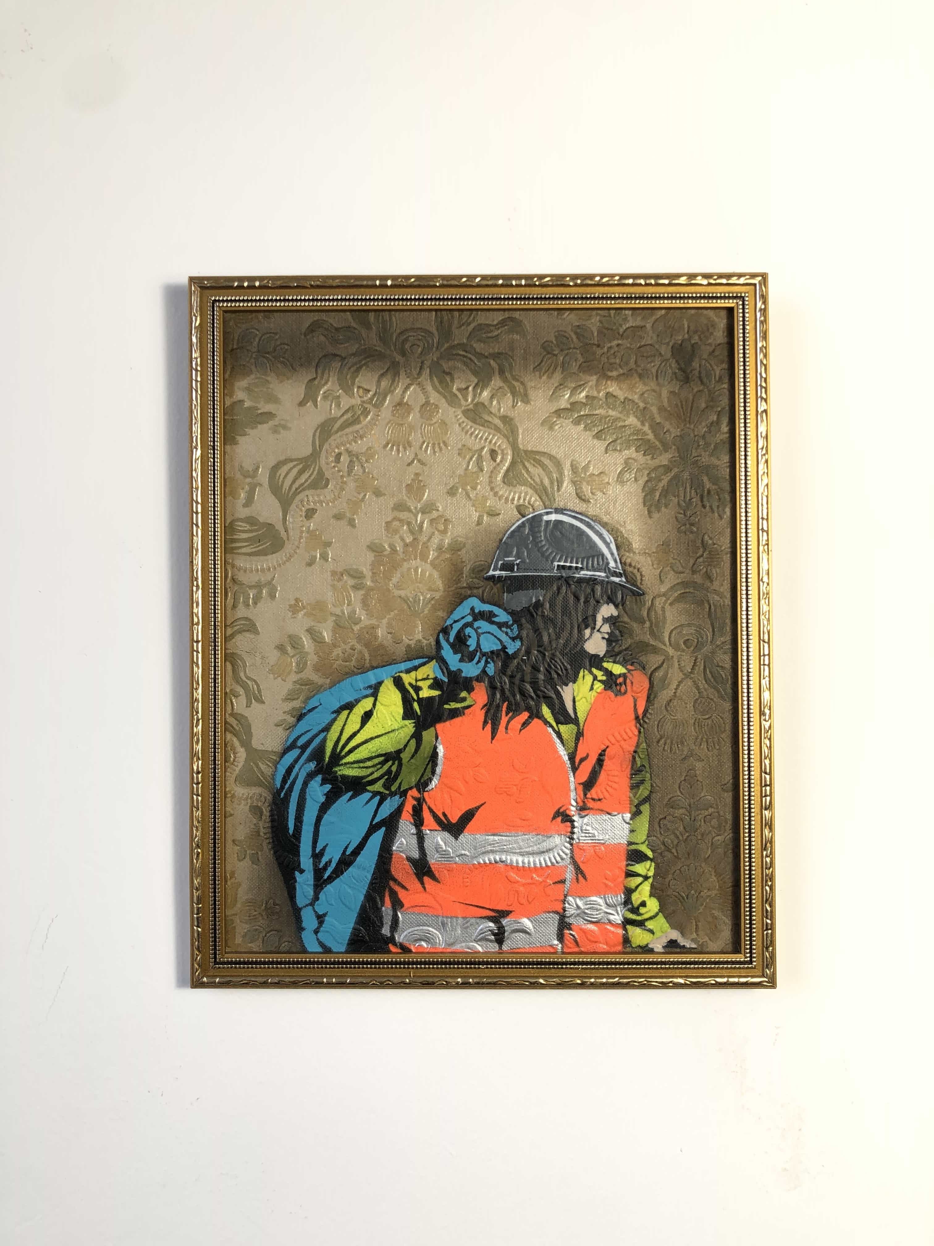 Vendue avec encadrement. Présentée de profil dans un cadre doré, une figure porte une masse repliée sur l’épaule. Le fond ornemental neutralise la charge suggérée, suspendant le mouvement entre responsabilité et immobilité.