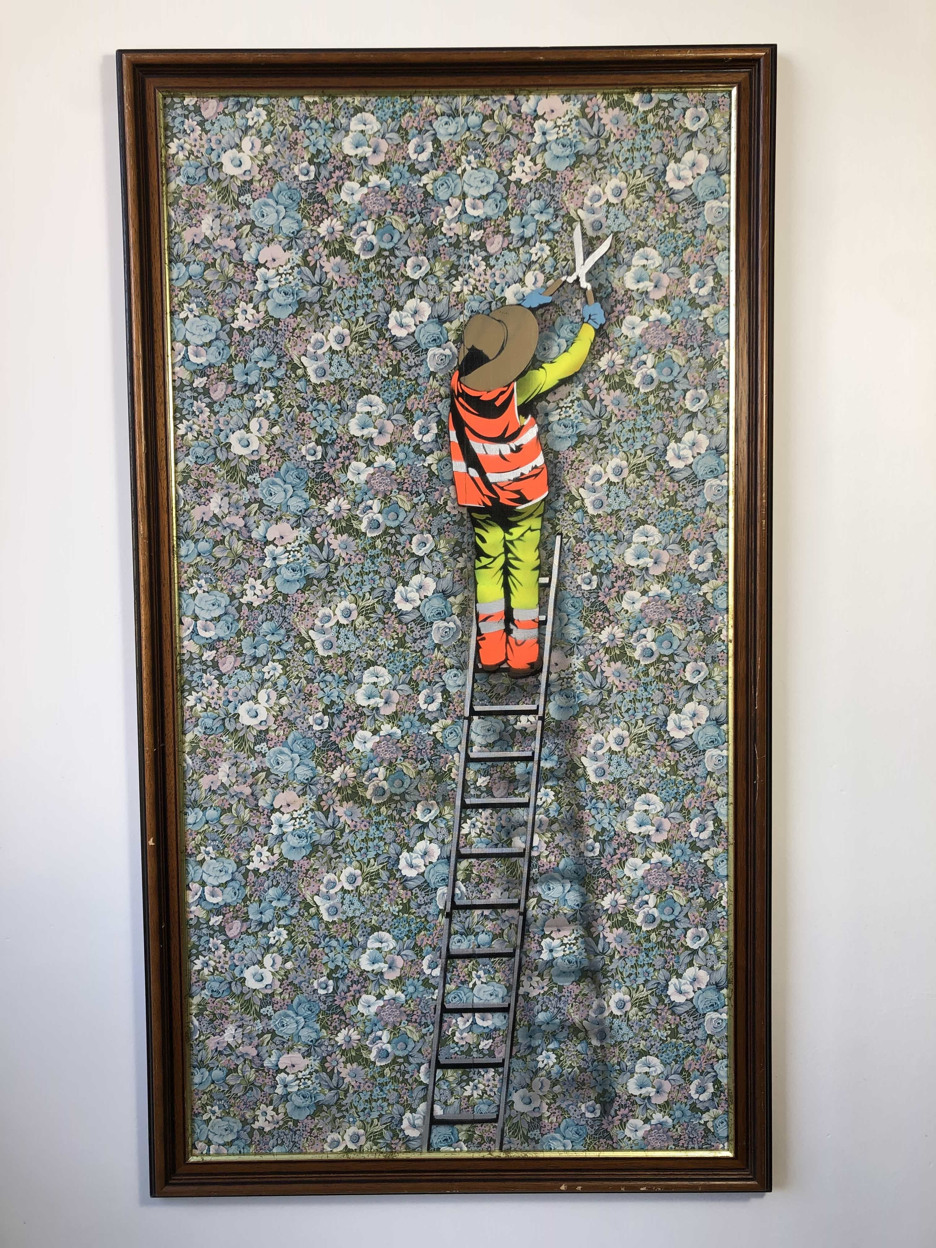 Vendue avec encadrement. Contenue dans un cadre ancien vertical, une figure gravit une échelle en direction même du motif décoratif. Le geste suggère une tâche sans fin, où le travail se confond avec l’ornement et où le progrès se dissout dans la répétition.