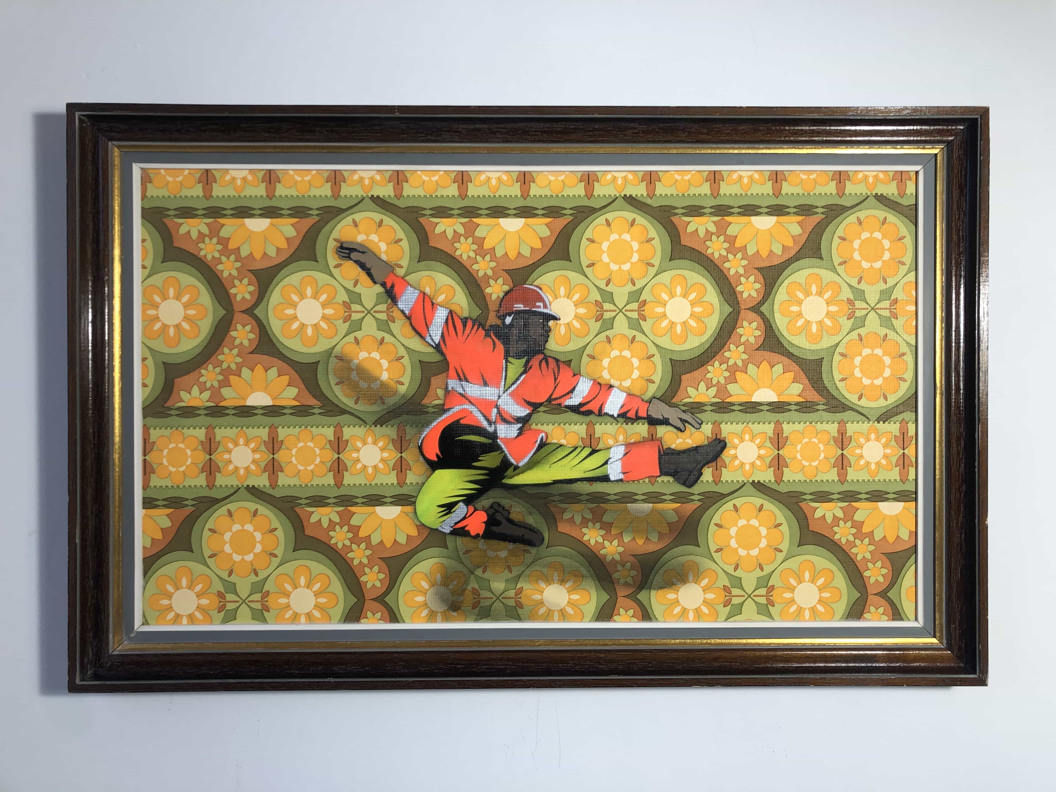 AcheterVendue avec encadrement. Un travailleur est saisi en plein saut, figé dans une posture aérienne inspirée de la danse. Le fond ornemental accentue l’illusion de légèreté et transforme l’effort en instant suspendu.