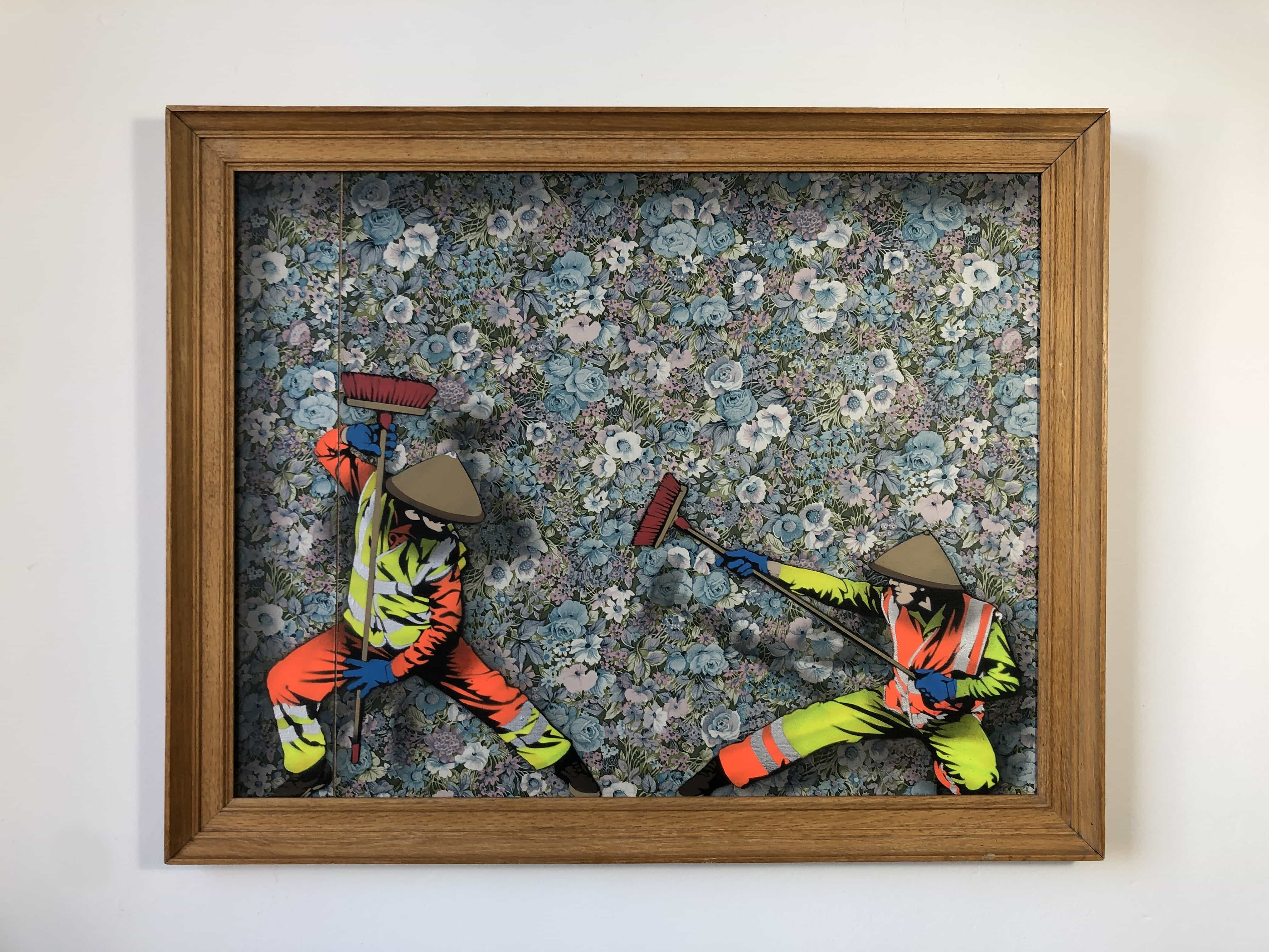 AcheterVendue avec encadrement. Deux travailleurs, armés de balais, se font face dans une composition tendue évoquant un duel chorégraphique. Les outils de nettoyage deviennent des prolongements du corps, entre jeu, confrontation et mouvement maîtrisé.