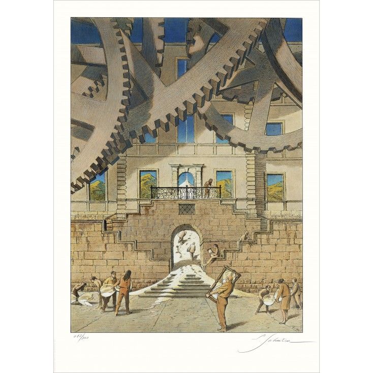 AcheterDans L’Escalier du Temps, François Schuiten transforme l’architecture en un mécanisme vivant, où d’immenses engrenages dominent des ouvriers façonnant le cours du temps. L’escalier devient un passage entre les époques, sculpté marche après marche par la main humaine. Présentée par la Buronzu Gallery, cette œuvre reflète la vision poétique de Schuiten, où technologie, histoire et imagination s’emboîtent comme des rouages.