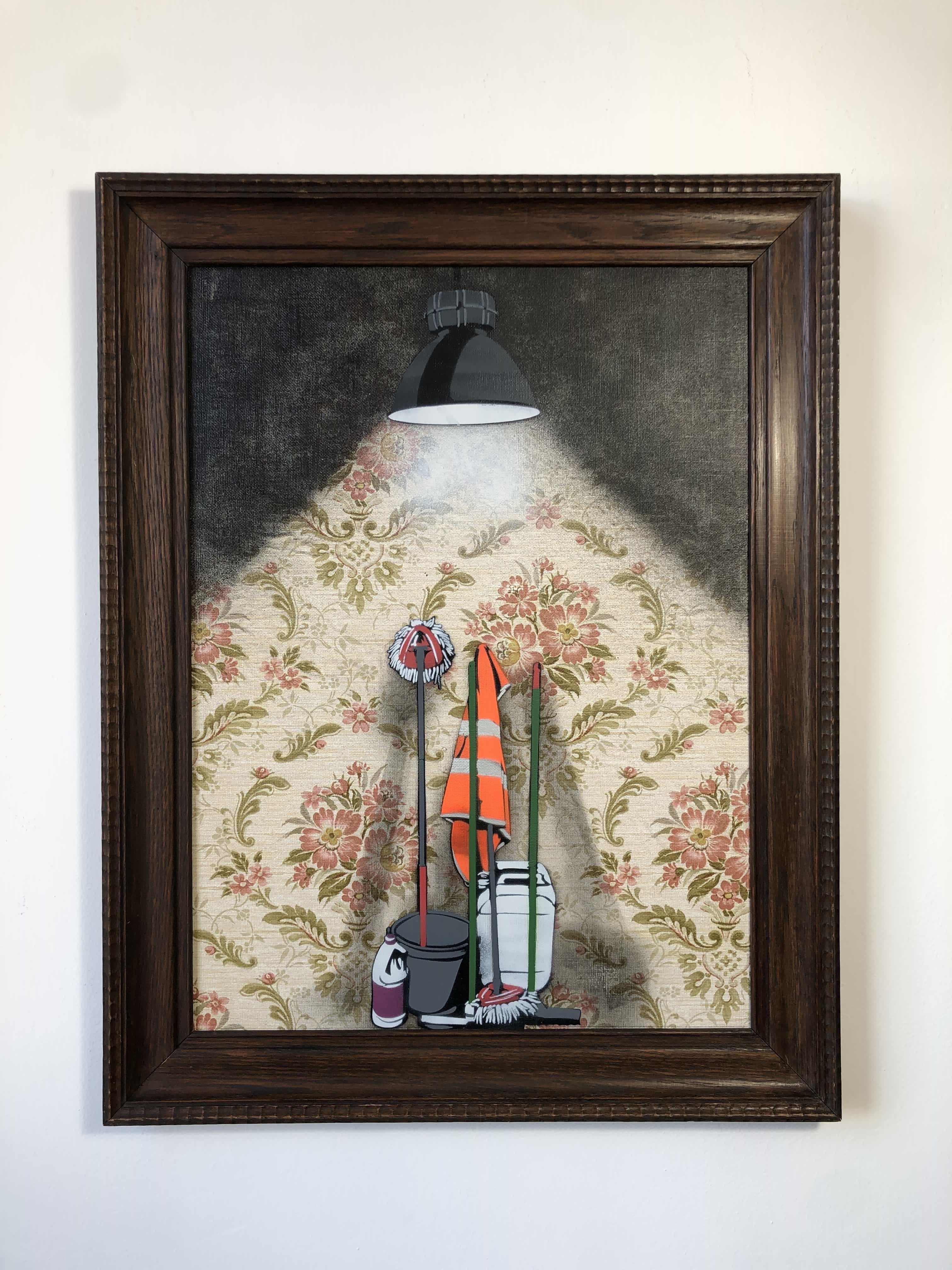 AcheterVendue avec encadrement. Des outils de nettoyage et un gilet de chantier sont disposés sous une lumière artificielle, comme une scène silencieuse. L’absence du corps transforme ces objets utilitaires en témoins discrets du travail invisible et quotidien.