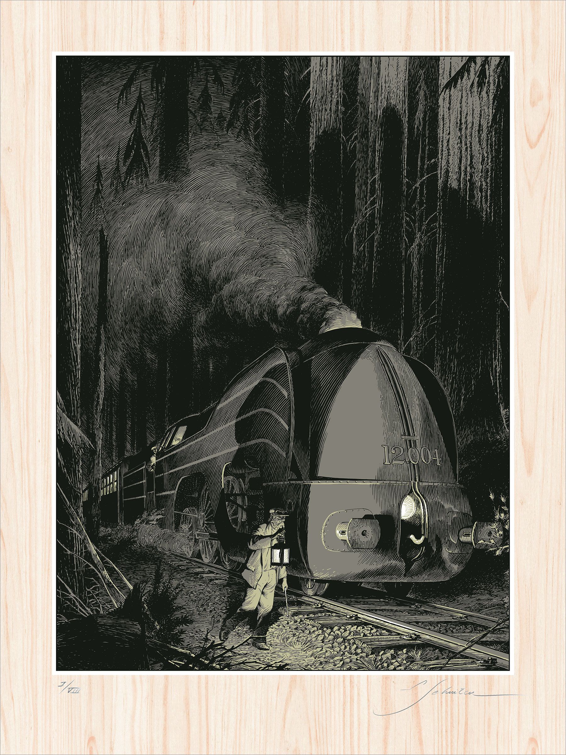 RéserverDans cette sérigraphie sur bois, présentée par Buronzu Gallery, la mythique Type 12 fait halte au cœur d’une forêt silencieuse. La lanterne du conducteur perce l’obscurité tandis que la machine semble hésiter entre puissance et mystère. Schuiten capture un instant suspendu, où la nature et la technologie se frôlent dans la nuit.
