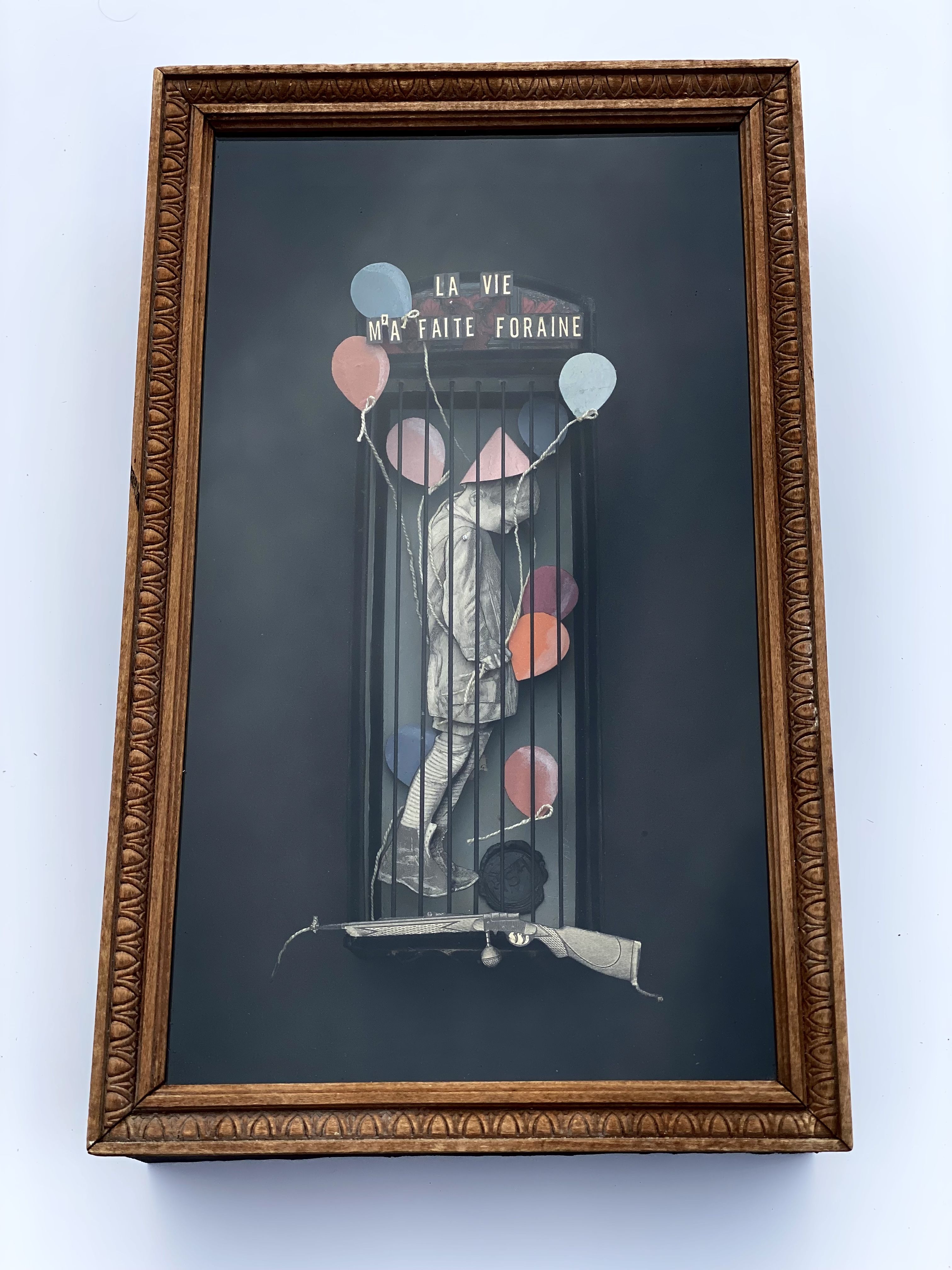 RéserverCette œuvre est signée Madame, une artiste parisienne. Sans cesse à la recherche de matériaux anciens du 19ème et du début du 20ème siècle, Madame fait dialoguer les matières, les temporalités et les publics et confronte ainsi le passé et le présent. Avec son travail de collage entre textes et images, elle crée des petits formats transformés par la suite en affiches.