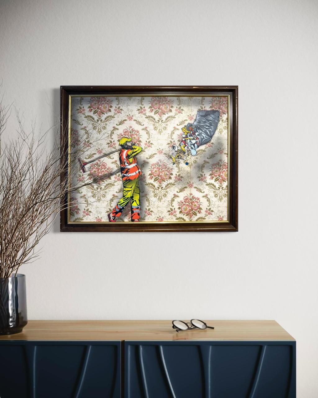 AcheterSur un papier peint fleuri, un agent d’entretien se transforme en golfeur improvisé. Avec son balai en guise de club et un sac-poubelle rempli de déchets comme balle, Jaune détourne les codes sociaux et souligne avec ironie les inégalités entre classes.