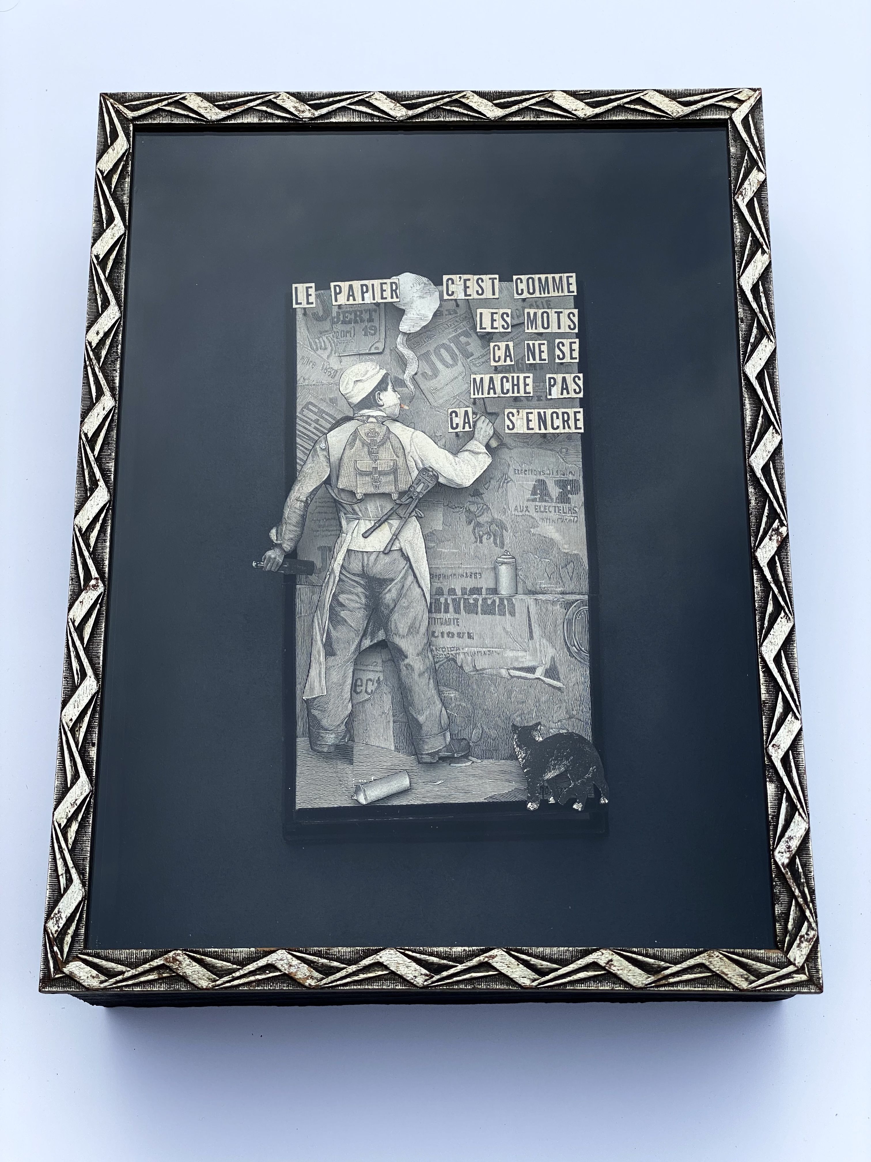 RéserverCette œuvre est signée Madame, une artiste parisienne. Sans cesse à la recherche de matériaux anciens du 19ème et du début du 20ème siècle, Madame fait dialoguer les matières, les temporalités et les publics et confronte ainsi le passé et le présent. Avec son travail de collage entre textes et images, elle crée des petits formats transformés par la suite en affiches.