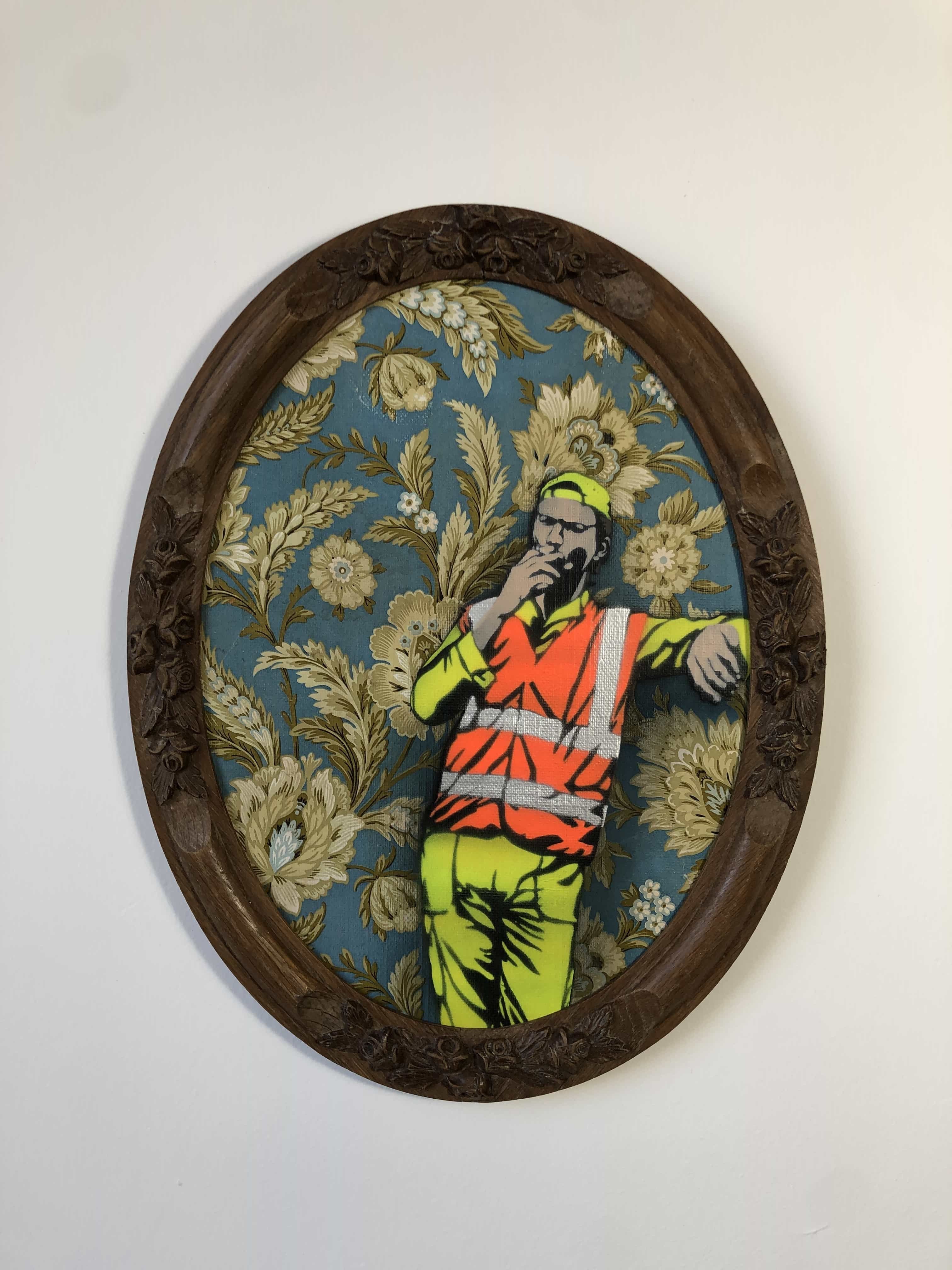 AcheterVendue avec encadrement. Inscrite dans un cadre ovale ancien, une figure contemporaine se détache sur un fond textile floral dense. La tenue de travail fluorescente vient troubler l’harmonie décorative, instaurant une tension subtile entre réalité sociale et tradition ornementale.