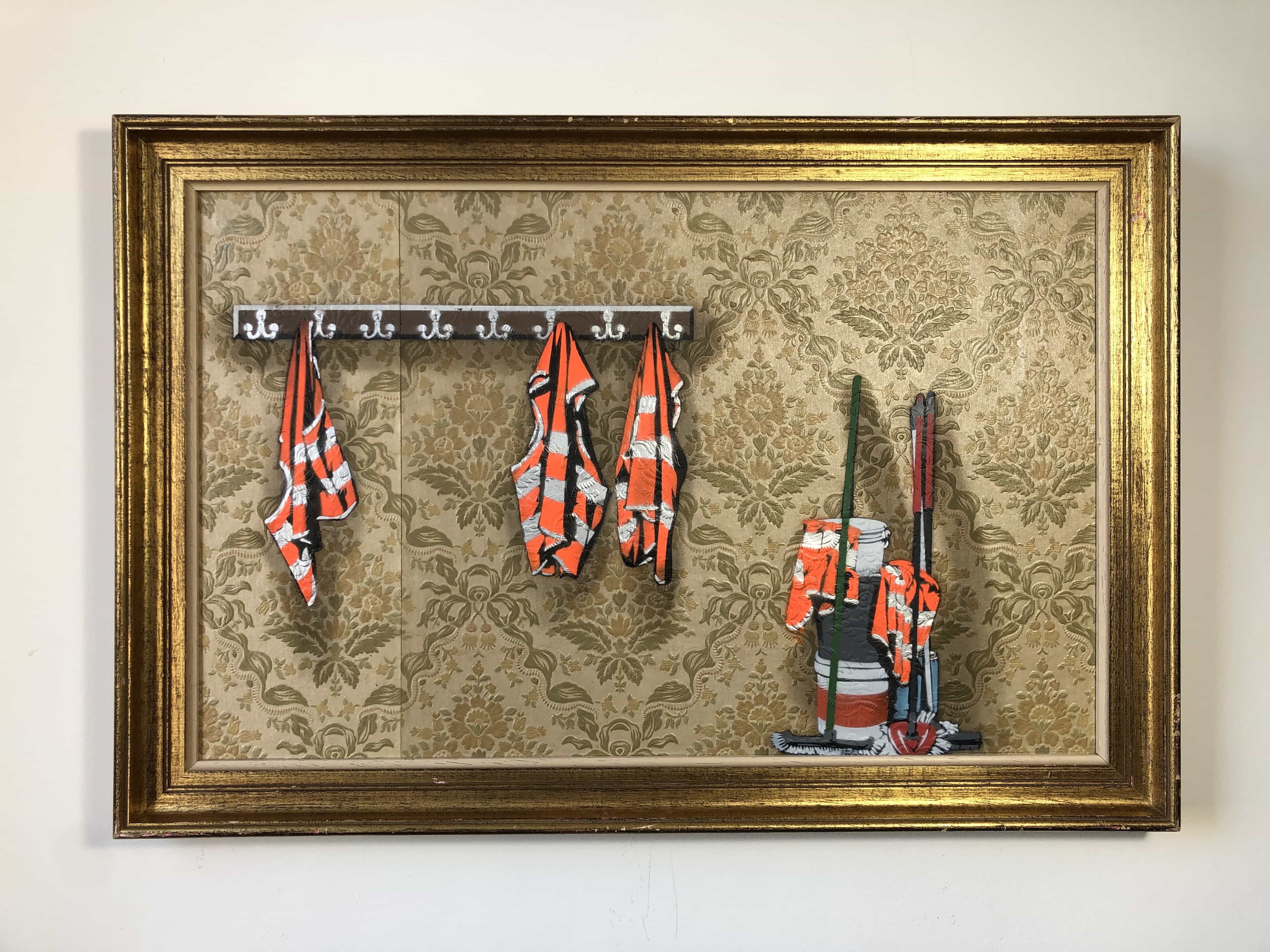 AcheterVendue avec encadrement. Des gilets de chantier suspendus à des patères composent une scène domestique dépourvue de présence humaine. Le vêtement devient trace, évoquant le corps absent et la répétition silencieuse du travail.