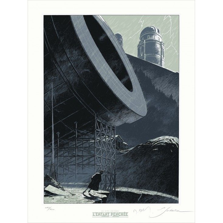 AcheterDans L’Enfant penchée, François Schuiten dévoile un instant de fragile émerveillement : une immense structure circulaire inclinée se dresse sous l’orage, tandis qu’une silhouette minuscule s’en approche, attirée par sa force énigmatique. À la Buronzu Gallery, cette œuvre apparaît comme un fragment poétique des Cités Obscures, où l’architecture s’anime et où la gravité semble se plier aux émotions. C’est une histoire de curiosité, de vertige et de la beauté étrange des mondes en déséquilibre.