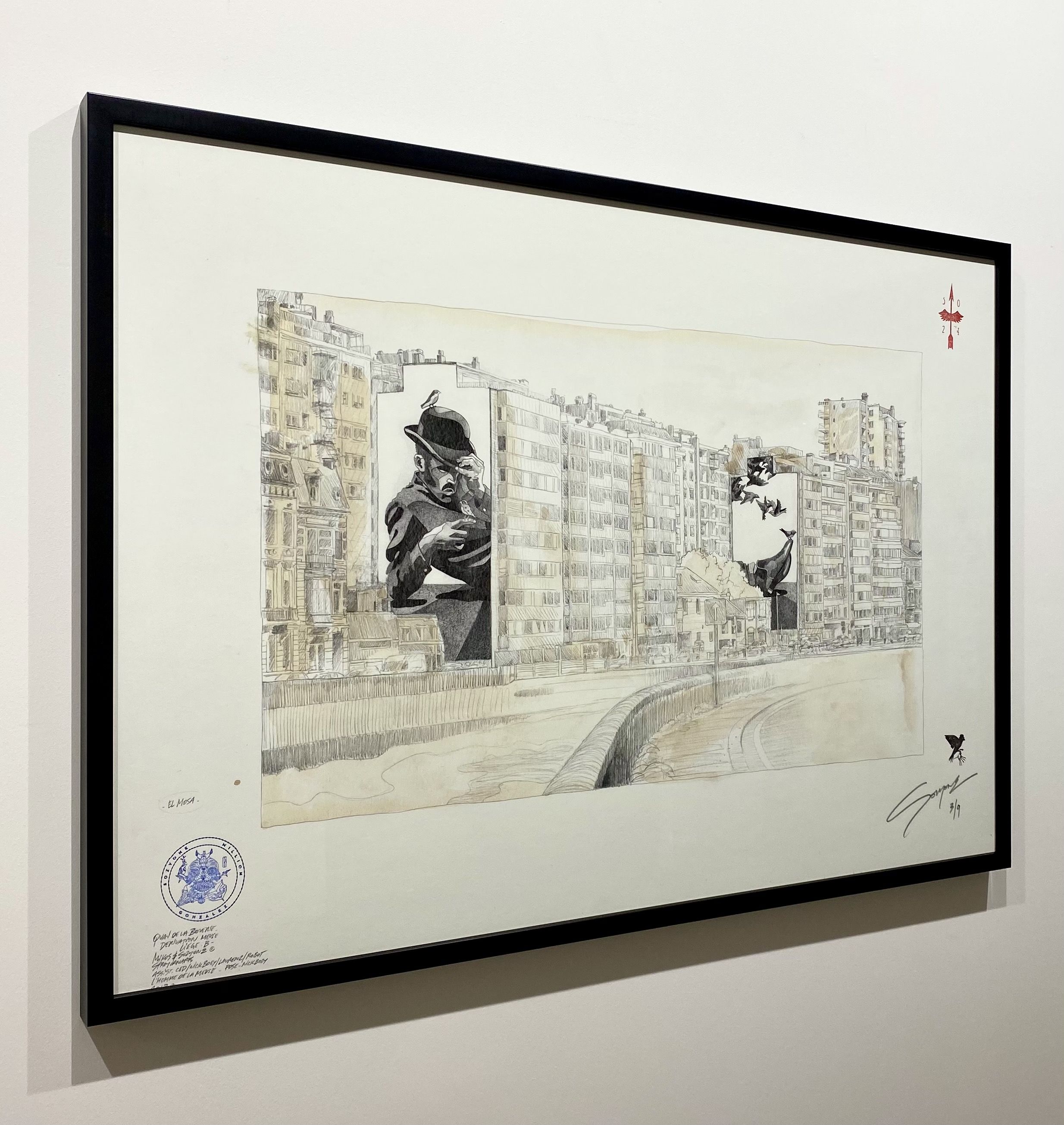 Cette digigraphie est signée Sozyone Gonzalez, un artiste bruxellois et d’origine espagnole. Au départ adepte du graffiti dans la rue, Sozyone est devenu peu à peu un pilier de la culture urbaine grâce à sa peinture et à sa musique. Ses œuvres mêlent les aplats de couleurs électriques aux personnages réalistes ou imaginaires. Le style de Sozyone a d’ailleurs marqué deux façades de la ville de Liège avec la fresque monumentale “L’Homme de la Meuse”.