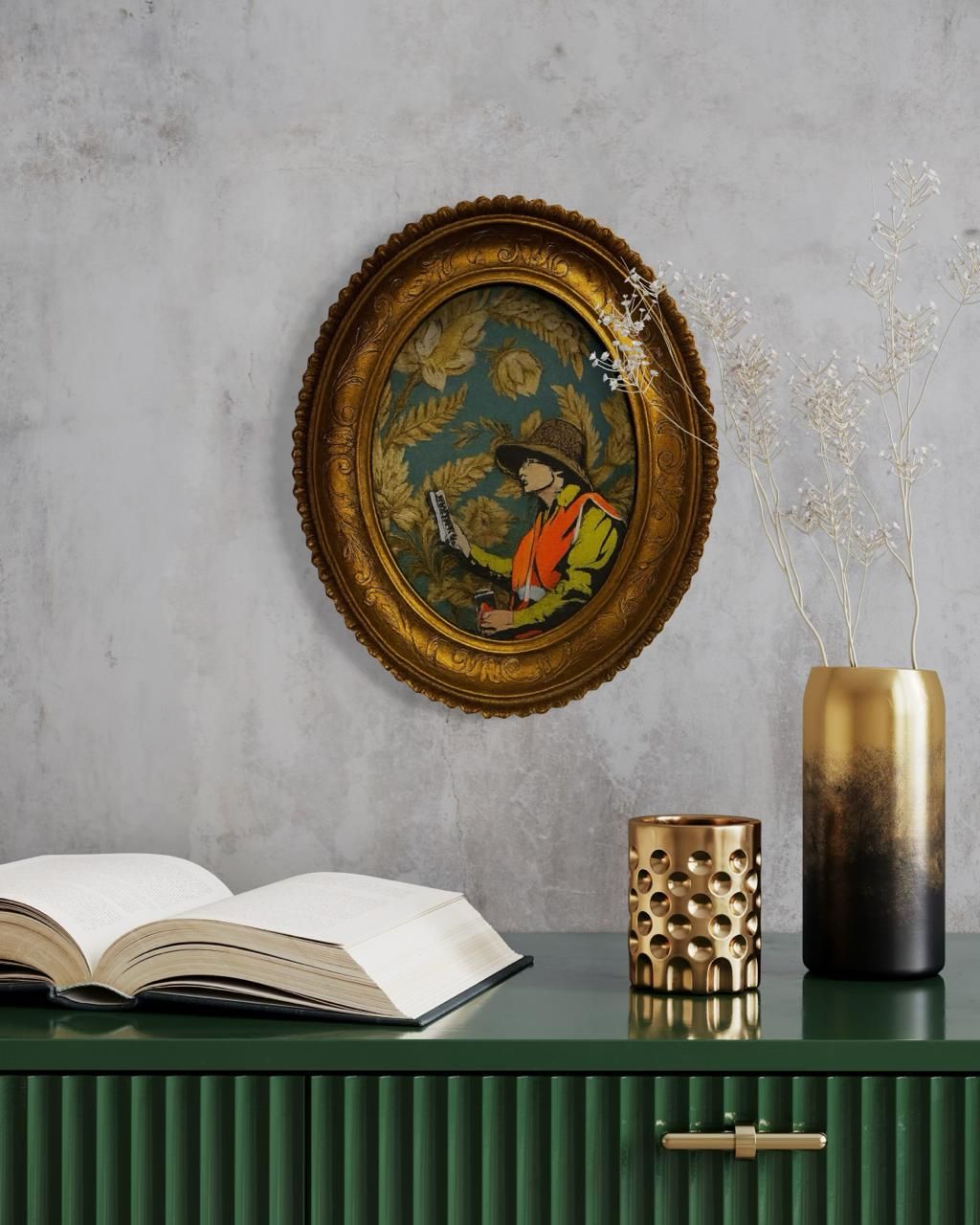 AcheterEncadrée dans un médaillon doré rappelant les portraits classiques, la scène montre un travailleur municipal en pause, pensif, une brosse à la main. Le contraste entre le cadre noble et le sujet trivial donne toute sa force à l’œuvre : un hommage tendre et ironique aux invisibles du quotidien.