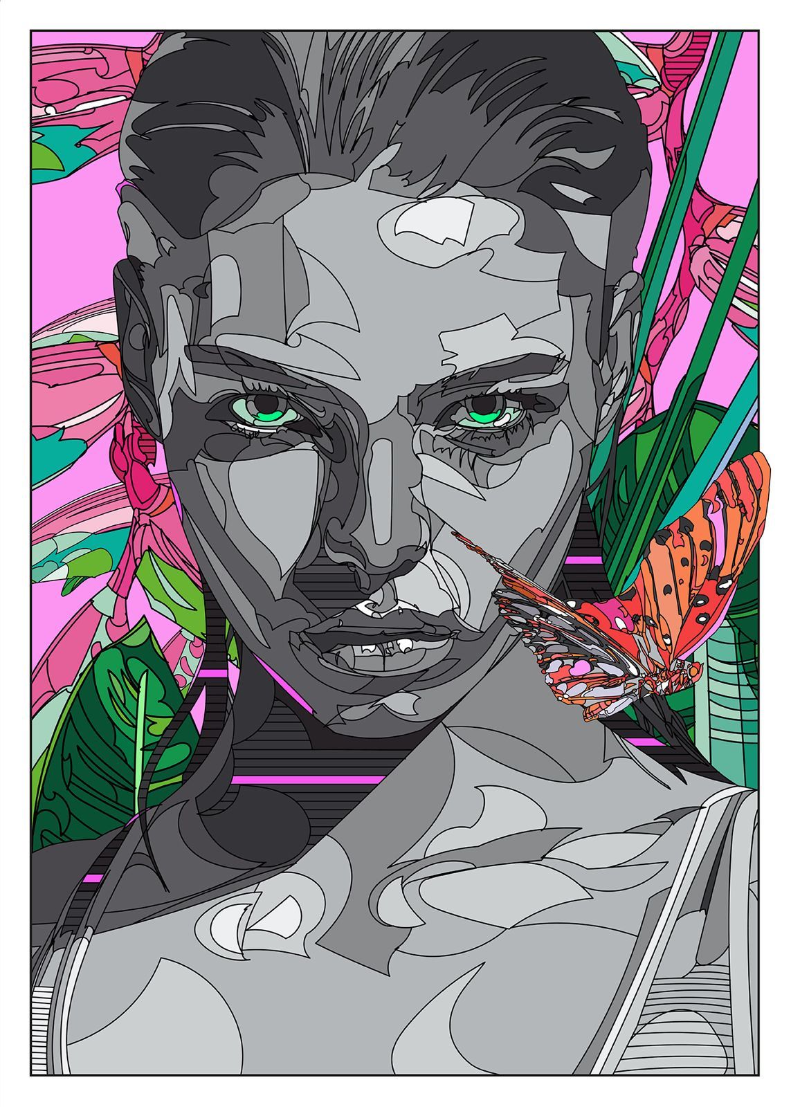 Une figure féminine au regard hypnotique émerge d’un jeu de lignes graphiques et de teintes contrastées. La peau, composée de facettes grises subtilement ombrées, s’illumine au contact du papillon orange éclatant posé près de son visage. L’arrière-plan végétal et rose amplifie la puissance de ce contraste, conférant à l’œuvre une aura magnétique. Ce portrait hybride, entre humanité et abstraction, explore la beauté brute et la fragilité poétique de l’instant.