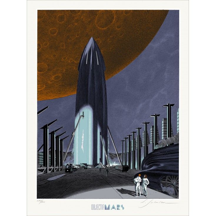 AcheterDans Objectif Mars, François Schuiten imagine une fusée monumentale, dressée comme une cathédrale d’acier sous l’immense disque orangé de Mars. Deux astronautes s’apprêtent à entrer dans l’inconnu, au bord d’un moment historique. Présentée par la Buronzu Gallery, cette estampe reflète le mélange unique de rétro-futurisme et d’émerveillement propre à Schuiten—un futur à la fois improbable et évident.
