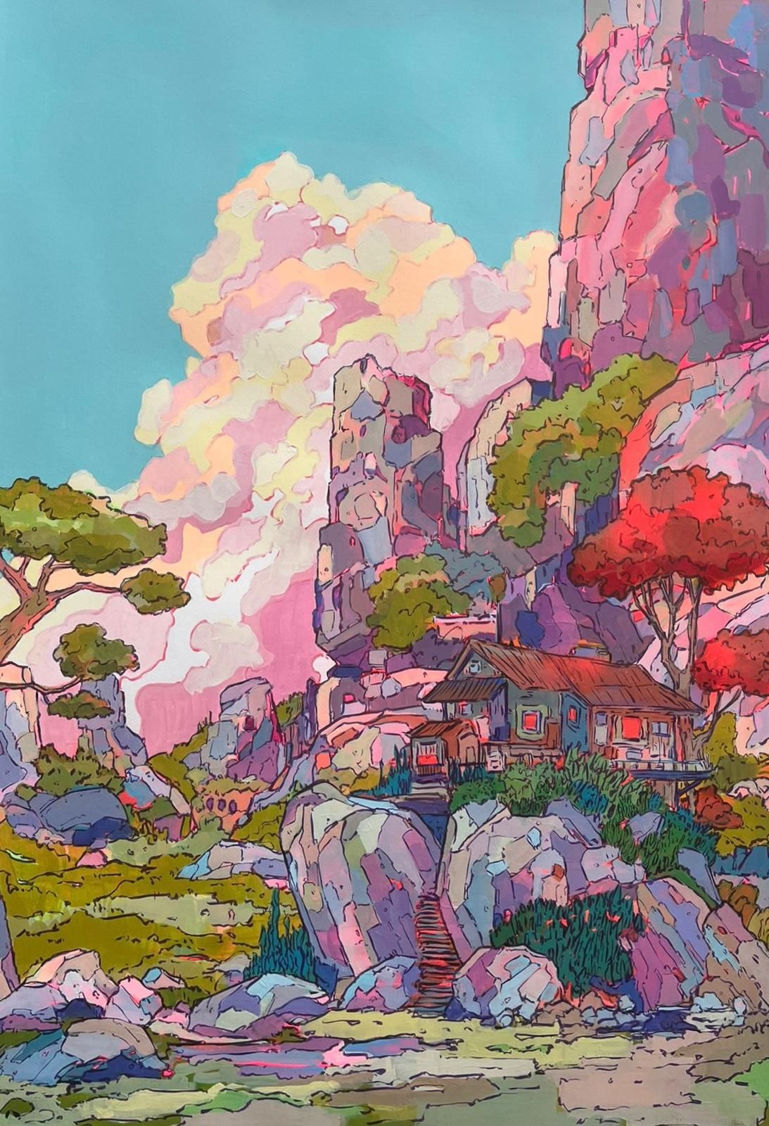 AcheterUne scène onirique où la nature est sublimée par des couleurs éclatantes : montagnes, arbres et ciel nuageux se parent de teintes pastel. Psoman crée un paysage presque irréel, oscillant entre rêve et réalité, invitant à la contemplation et à l’évasion.