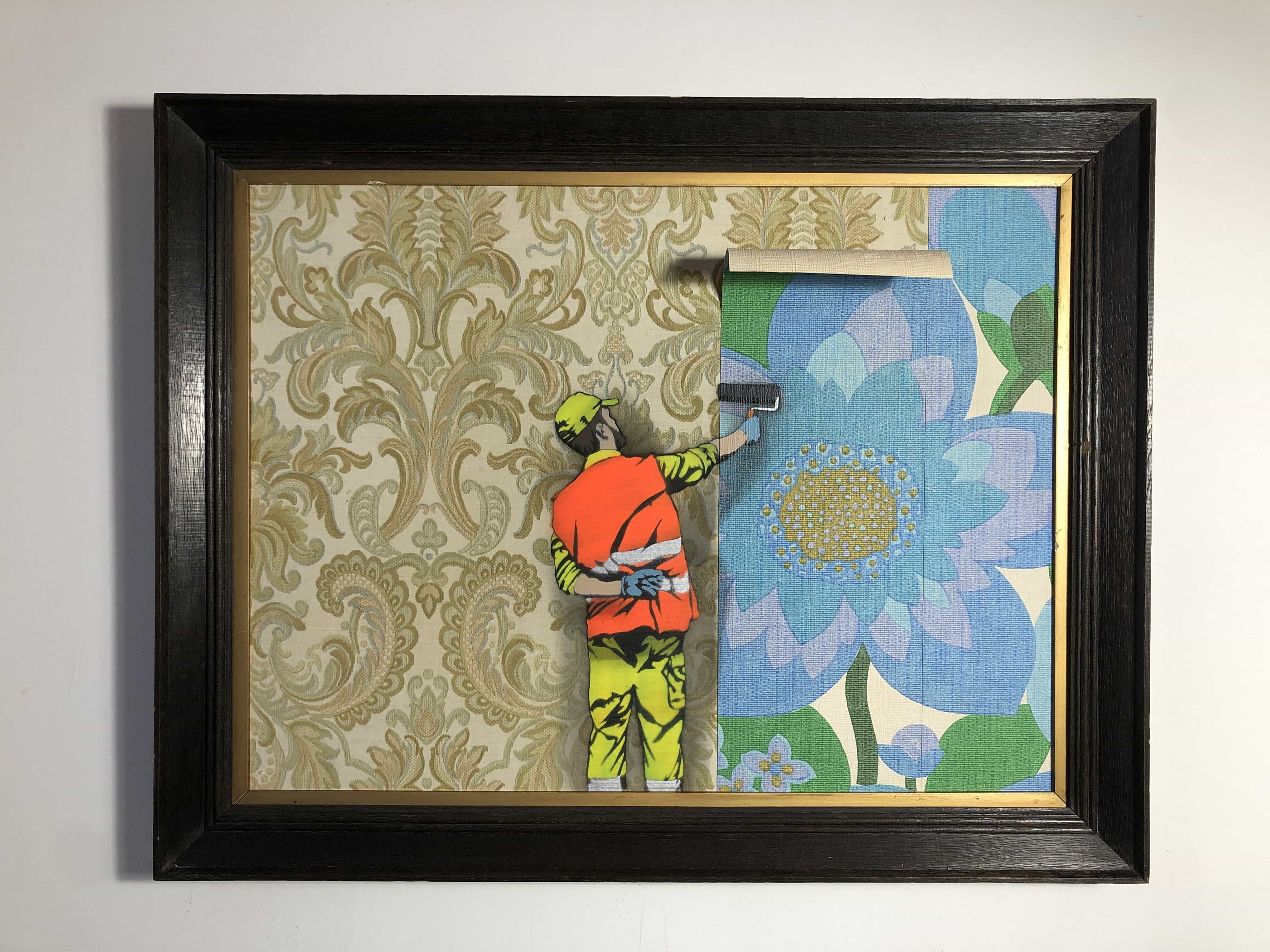 AcheterVendue avec encadrement. Un travailleur applique un papier peint, révélant par son geste une transition entre deux motifs décoratifs. L’action simple devient métaphore de transformation, entre effacement et apparition.