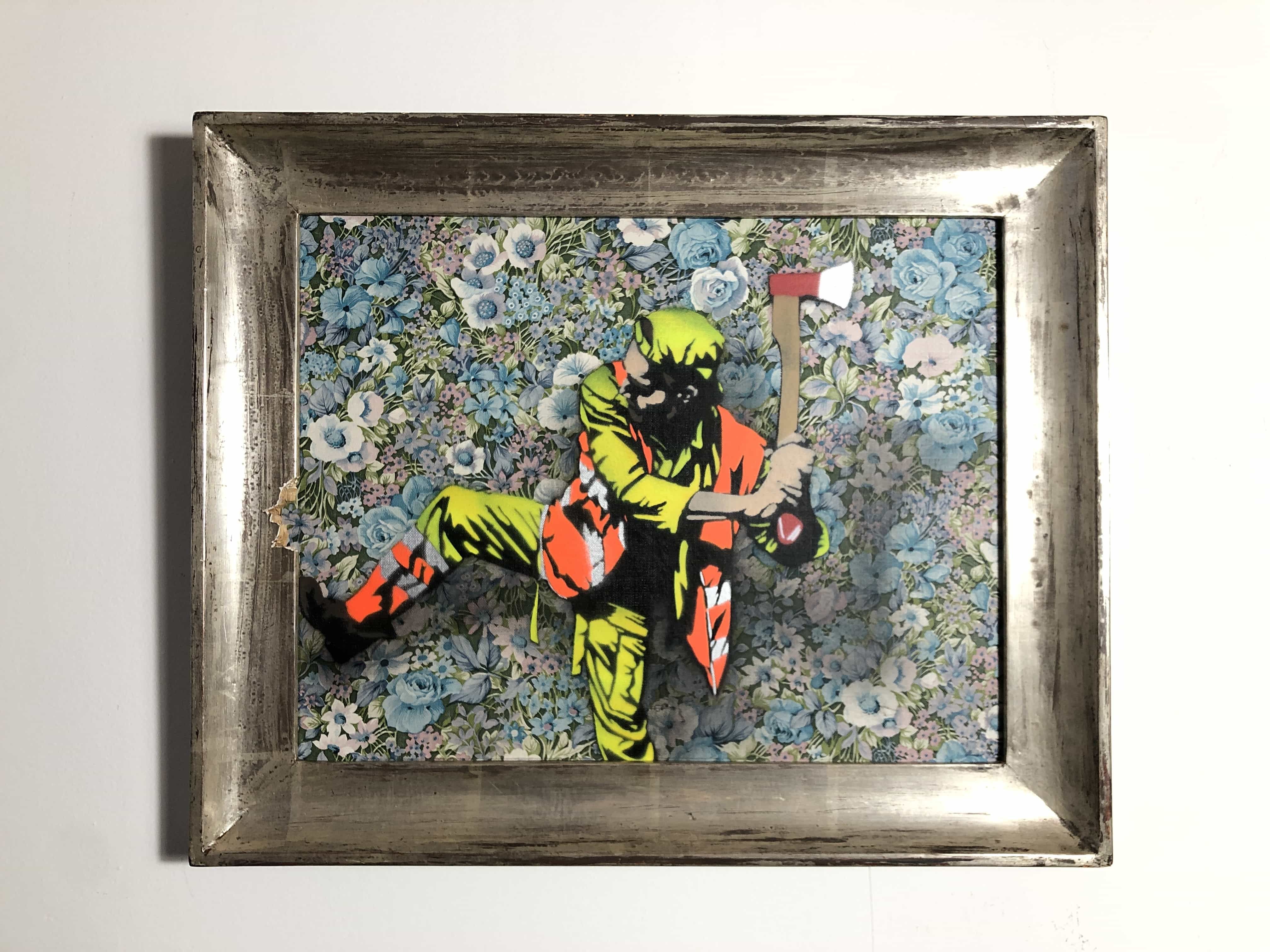 Vendue avec encadrement. Un travailleur brandit une hache dans une posture instable, suspendue entre effort, déséquilibre et menace. Le geste, amplifié par l’outil, oscille entre travail et violence symbolique.