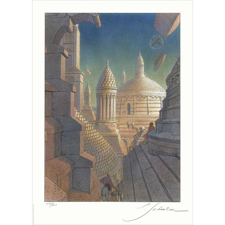 AcheterDans Périgueux, François Schuiten réinvente l’architecture historique de la ville en un paysage monumental, où dômes byzantins et volumes sculpturaux s’élèvent comme un dédale fantastique. Baignée d’une lumière chaleureuse et parcourue de silhouettes énigmatiques, la scène oscille entre mémoire ancienne et vision futuriste. Dans le ciel, des machines volantes dérivent doucement, incarnant la poésie architecturale et l’imaginaire unique de Schuiten. Cette œuvre remarquable est présentée par la Buronzu Gallery.