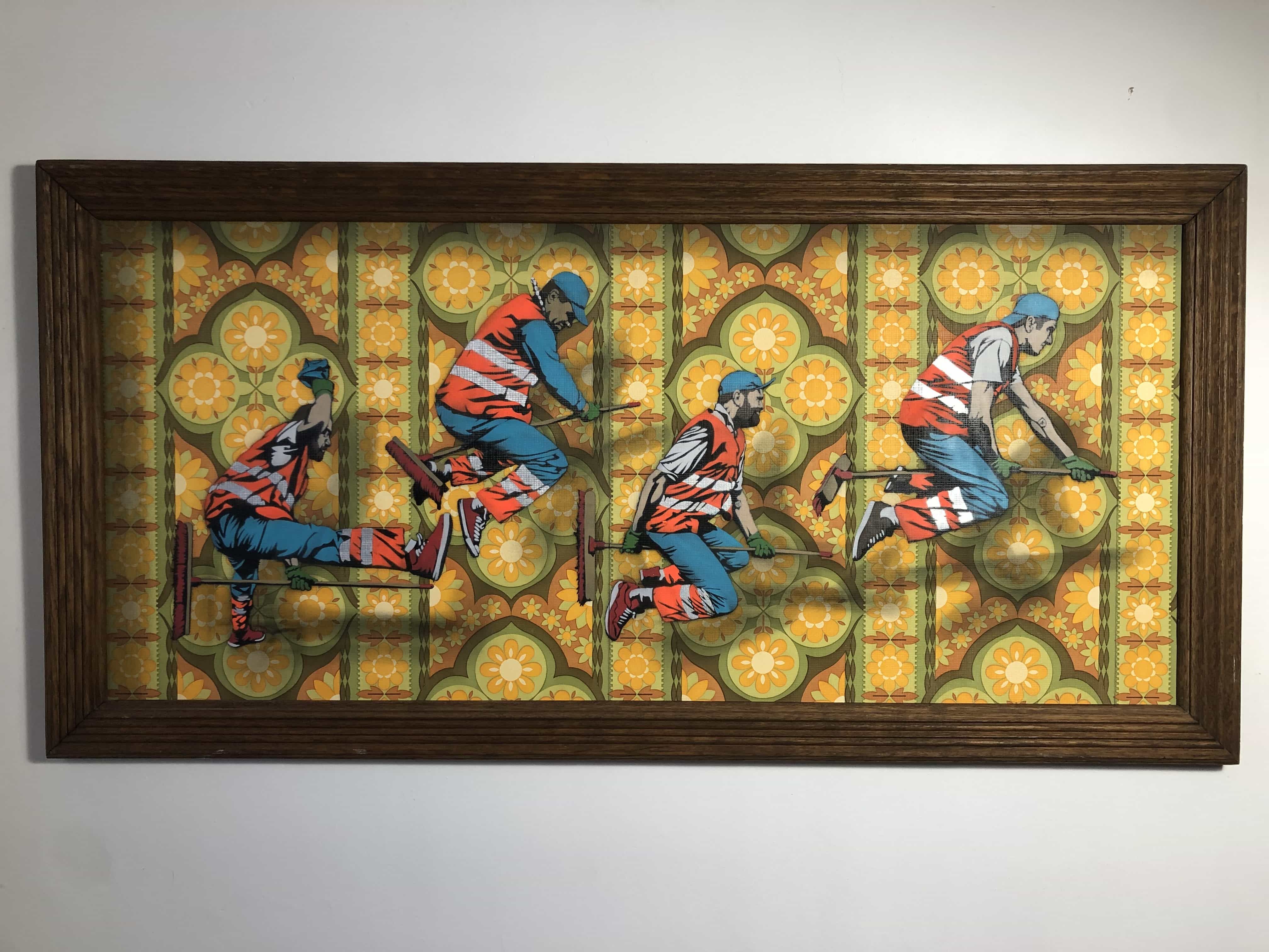 AcheterVendue avec encadrement. Une suite de travailleurs en mouvement compose une narration visuelle, où chaque posture prolonge la précédente. La répétition du geste transforme l’action de travail en une chorégraphie continue.