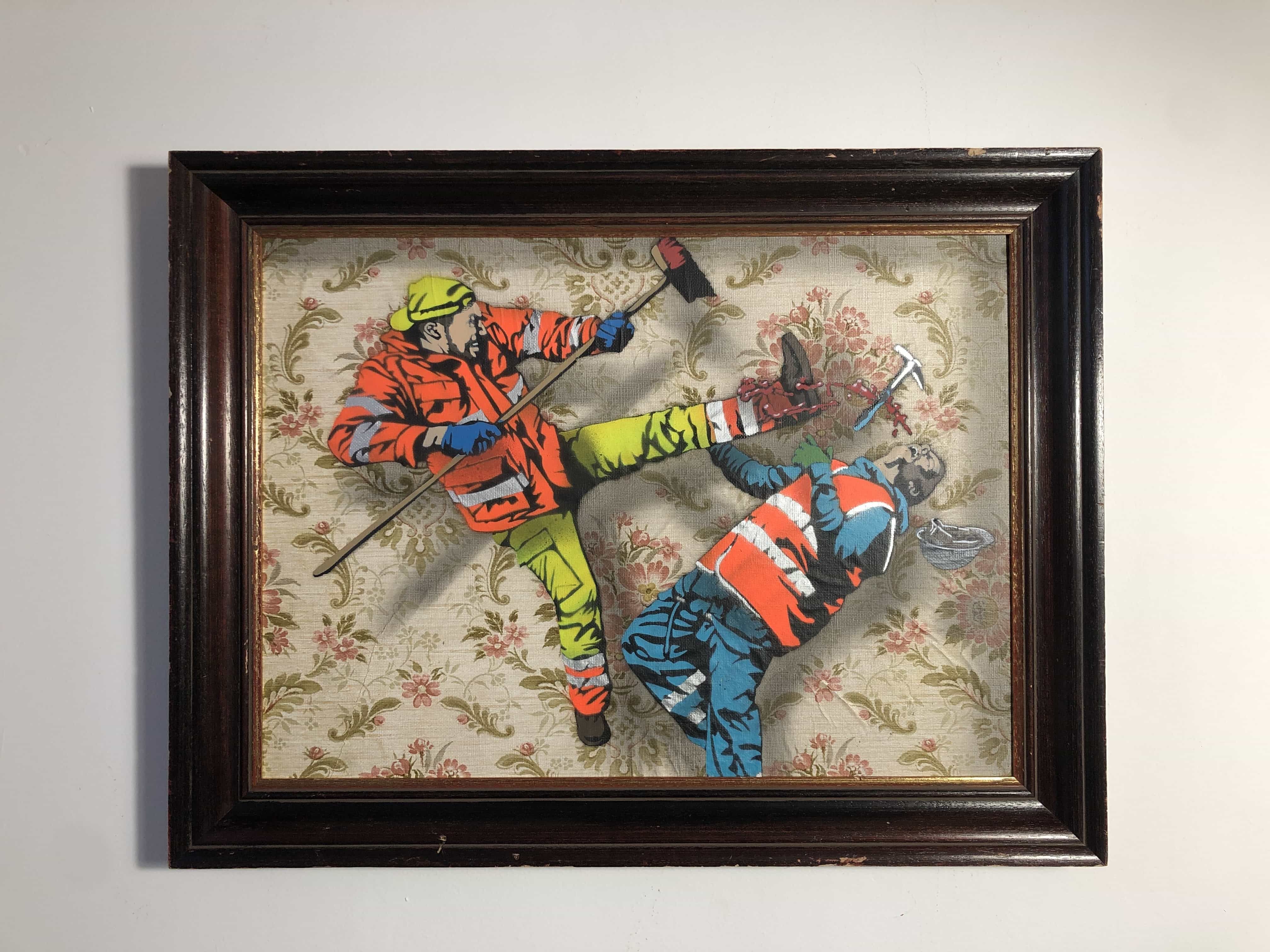 AcheterVendue avec encadrement. Deux travailleurs sont figés dans une scène de confrontation où l’outil devient arme et le geste bascule vers la violence chorégraphiée. La tension dramatique détourne l’imaginaire du travail vers celui du combat stylisé.