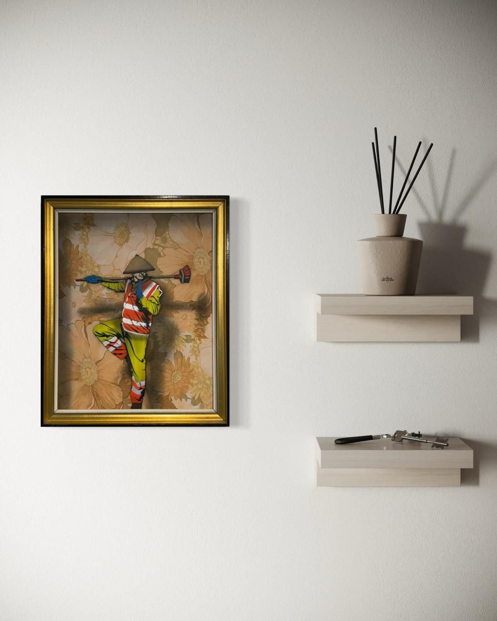 AcheterUn personnage vêtu de son uniforme fluorescent adopte la posture d’un maître zen. Entre équilibre et dérision, il tient un outil de nettoyage transformé en sceptre de méditation. Le fond floral vintage amplifie la dimension décalée de la scène.