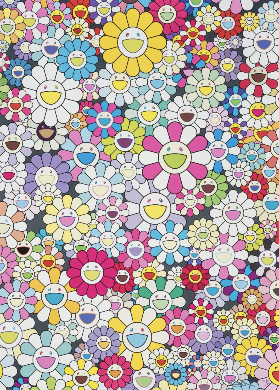 Cette œuvre colorée est signée Takashi Murakami, un artiste japonais de renommée mondiale. Peintre et sculpteur japonais, il est notamment connu comme l’initiateur du mouvement d’art contemporain, le Superflat, qui trouve ses influences dans les animes, les mangas et la pop-culture japonaise. Les œuvres de Takashi Murakami sont un voyage entre la tradition et la modernité. Ses fleurs colorées aux visages souriants sont sans doute sa marque de fabrique la plus reconnaissable.