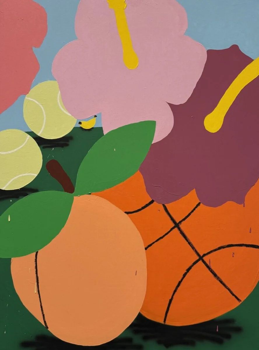 AcheterPeinture réalisée par l'artiste David Bruce et exposée pour la Buronzu Gallery lors de l'Affordable Art Fair à Bruxelles. Passionné par le graffiti, David Bruce s'installe à Liège où il réalise des oeuvres liés à ses souvenirs, comme le basket. Il utilise des couleurs vives et des objets du quotidien, comme des bananes ou des smileys.