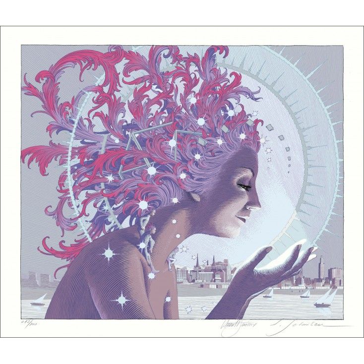 AcheterDans Sur les épaules des géants, François Schuiten imagine une muse céleste penchée sur la ville, sa chevelure faite de constellations tourbillonnantes et de mécanismes délicats. Elle tient une sphère lumineuse—savoir, mémoire ou avenir encore à écrire. Présentée par la Buronzu Gallery, l’œuvre célèbre la fusion poétique de la science, du mythe et des rêves architecturaux selon Schuiten.