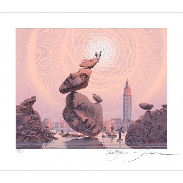 AcheterDans Sur les épaules des géants 2025, François Schuiten imagine une rive où d’immenses visages sculptés émergent tels des souvenirs anciens. Deux silhouettes minuscules gravissent les pierres en équilibre, tendues vers un ciel lumineux en spirale—une ascension vers la connaissance, la création et les forces invisibles qui nous façonnent. Présentée par la Buronzu Gallery, l’œuvre célèbre notre fragile équilibre entre passé et avenir, rappelant que l’humanité se tient—littéralement—sur les visages et les fondations de ceux qui l’ont précédée.