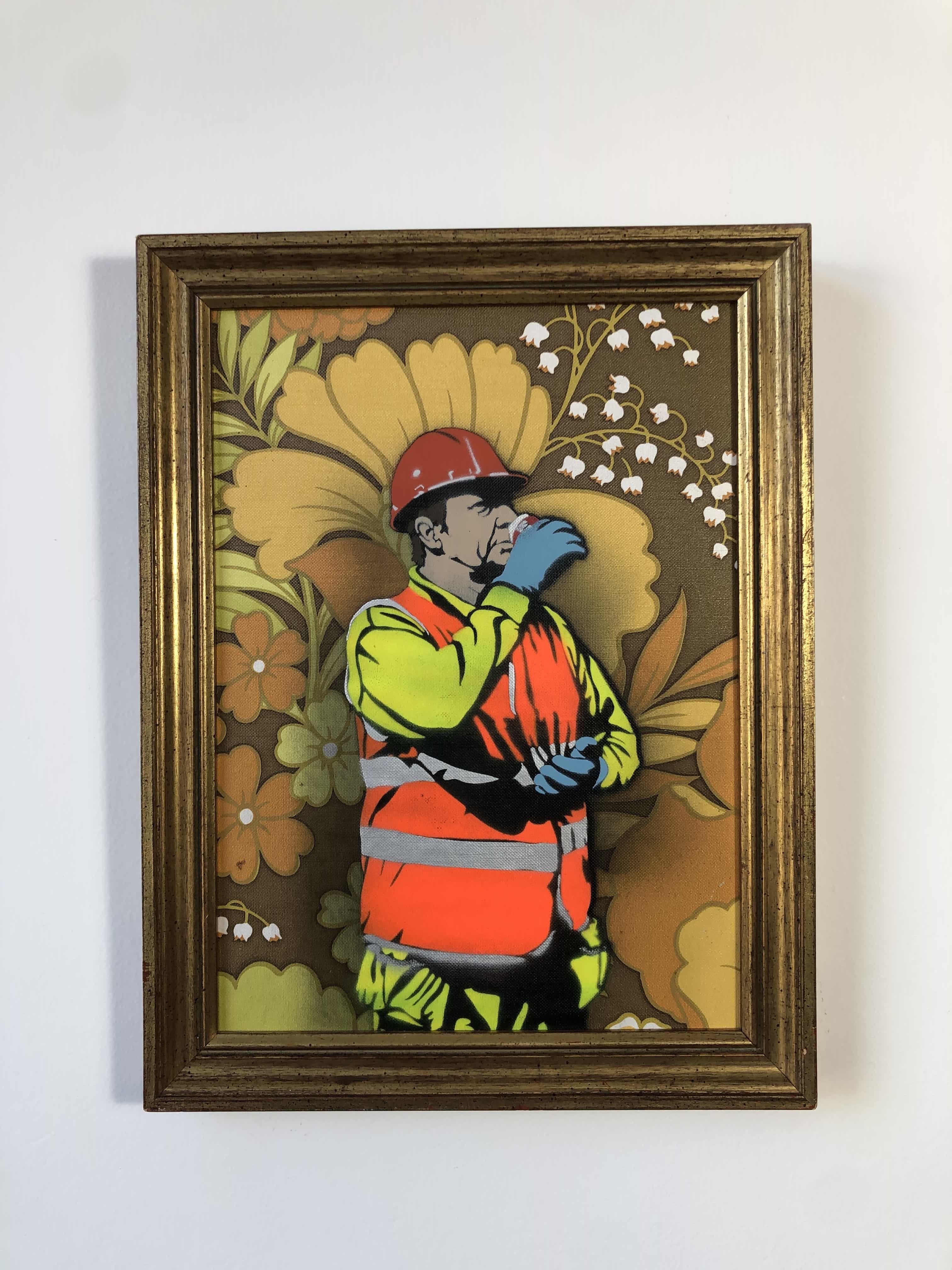 AcheterVendue avec encadrement. Placée dans un cadre ancien marqué par le temps, une figure solitaire est figée dans un geste suspendu, sur un fond ornemental aux tons chauds. La rencontre entre tenue industrielle et motifs décoratifs confère à l’instant ordinaire une dimension presque cérémonielle.