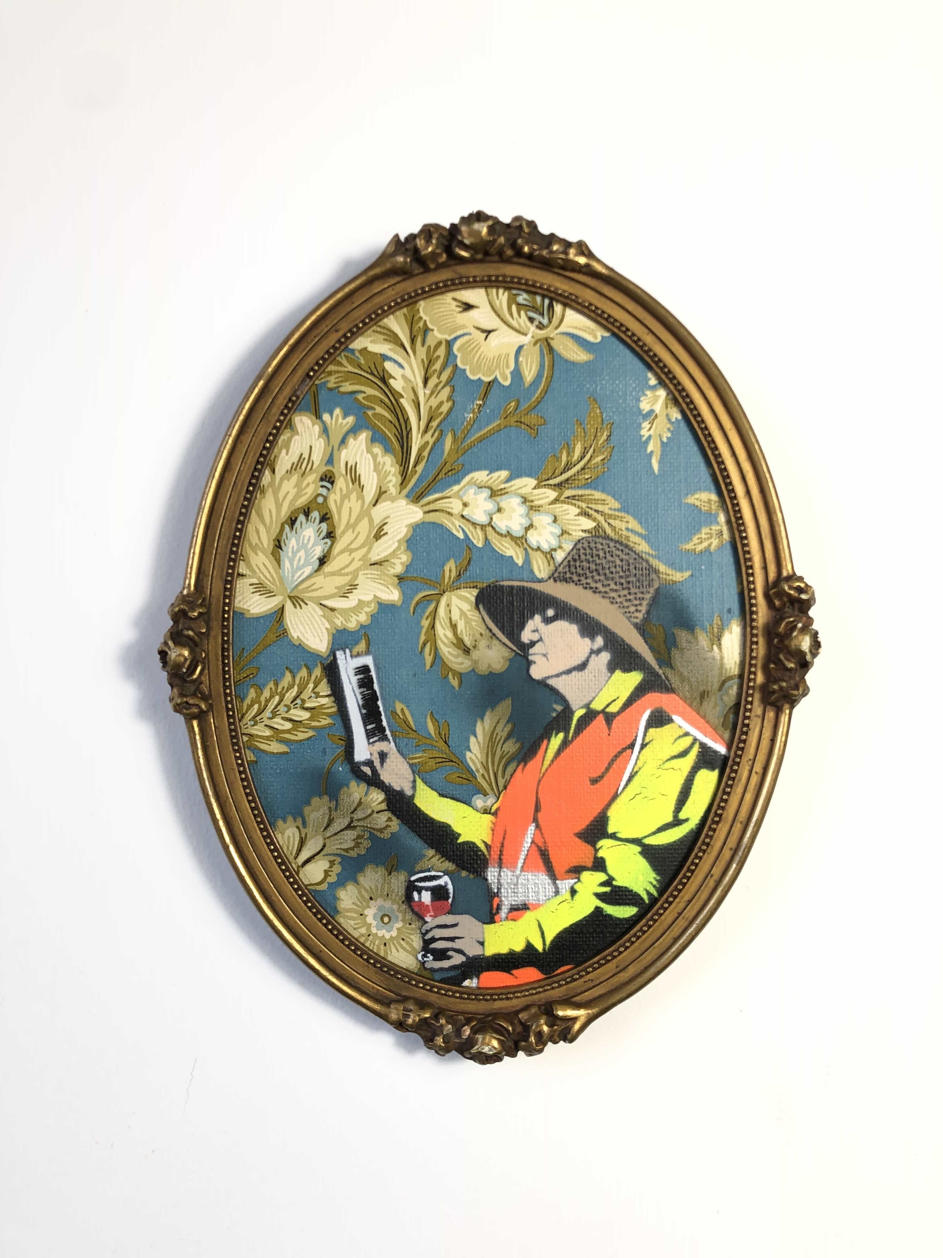 Vendue avec encadrement. Contenue dans un cadre ovale ancien, une figure lit tout en tenant un verre, prise entre concentration et relâchement. Le motif floral enveloppe la scène, suspendant l’attention entre travail, pause et ornement.