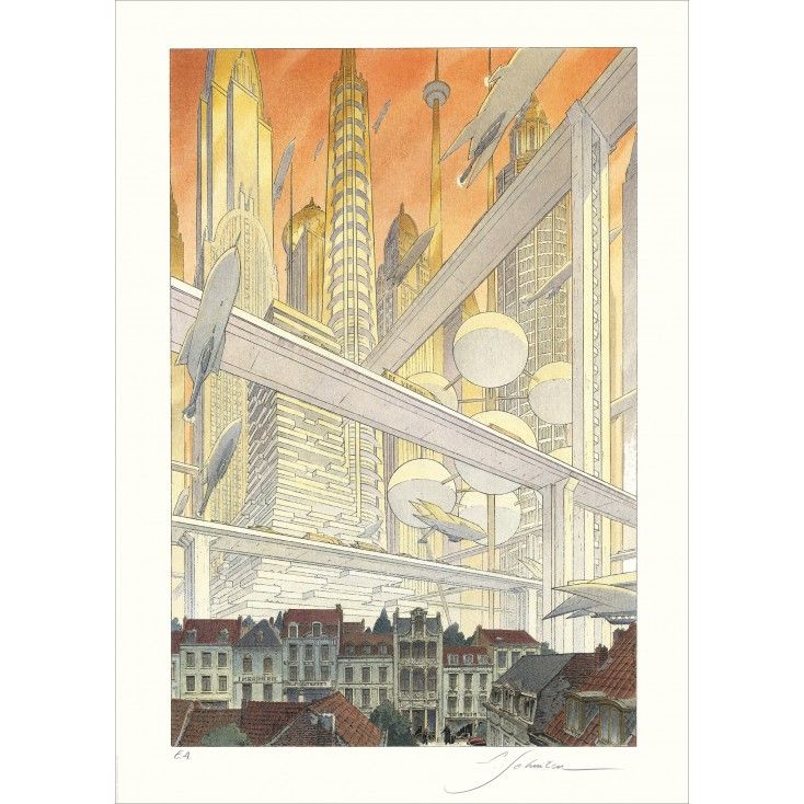 AcheterDans Utopies Bruxelloises, François Schuiten fusionne le vieux Bruxelles avec une métropole verticale futuriste, où des aéronefs glissent au-dessus des toits historiques. L’œuvre exprime la tension entre patrimoine et imagination, chère à l’univers de Schuiten. Présentée par la Buronzu Gallery, cette pièce ouvre une fenêtre sur le Bruxelles de demain.