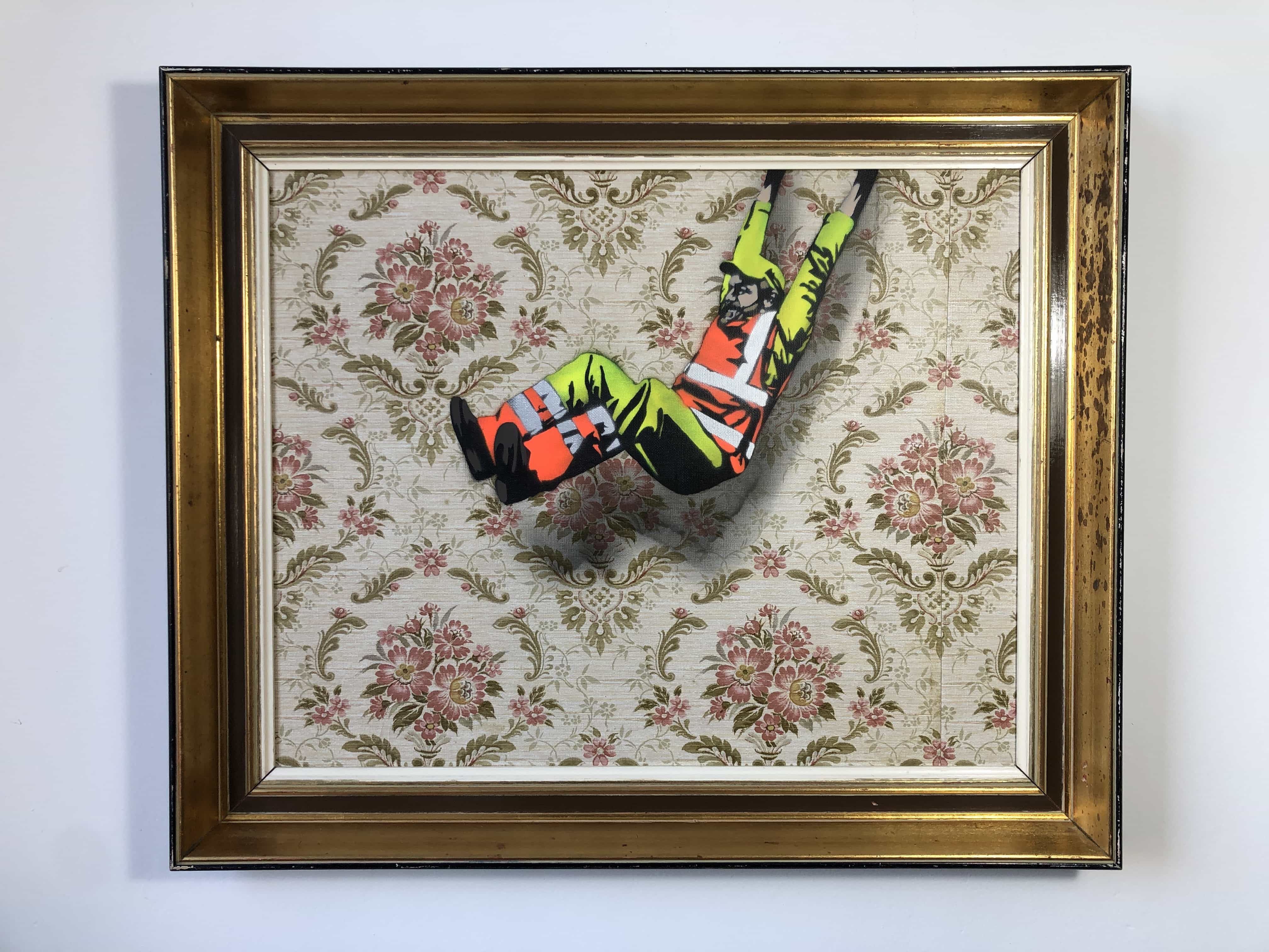 AcheterVendue avec encadrement. Encadrée par une bordure dorée, une figure solitaire semble saisie en pleine chute, les bras tendus vers le haut. La surface décorative interrompt la descente, suspendant la vulnérabilité entre perte de contrôle et retenue.