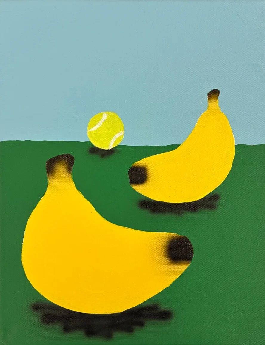 AcheterPeinture réalisée par l'artiste David Bruce et exposée pour la Buronzu Gallery lors de l'Affordable Art Fair à Bruxelles. Passionné par le graffiti, David Bruce s'installe à Liège où il réalise des oeuvres liés à ses souvenirs, comme le basket. Il utilise des couleurs vives et des objets du quotidien, comme des bananes ou des smileys.