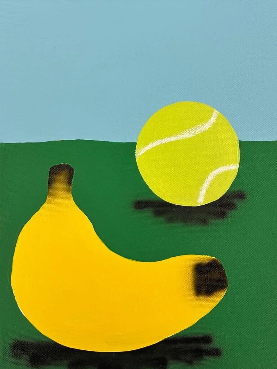 AcheterPeinture réalisée par l'artiste David Bruce et exposée pour la Buronzu Gallery lors de l'Affordable Art Fair à Bruxelles. Passionné par le graffiti, David Bruce s'installe à Liège où il réalise des oeuvres liés à ses souvenirs, comme le basket. Il utilise des couleurs vives et des objets du quotidien, comme des bananes ou des smileys.