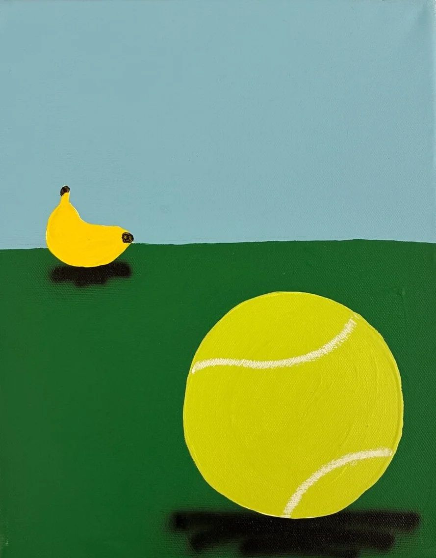 AcheterPeinture réalisée par l'artiste David Bruce et exposée pour la Buronzu Gallery lors de l'Affordable Art Fair à Bruxelles. Passionné par le graffiti, David Bruce s'installe à Liège où il réalise des oeuvres liés à ses souvenirs, comme le basket. Il utilise des couleurs vives et des objets du quotidien, comme des bananes ou des smileys.